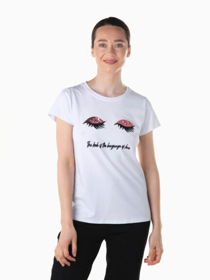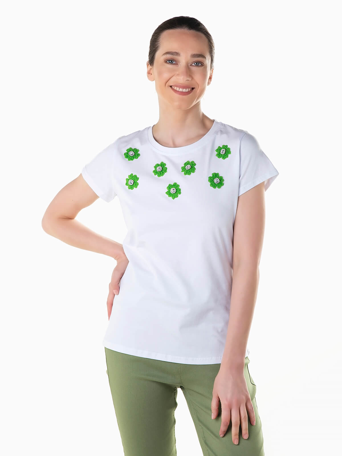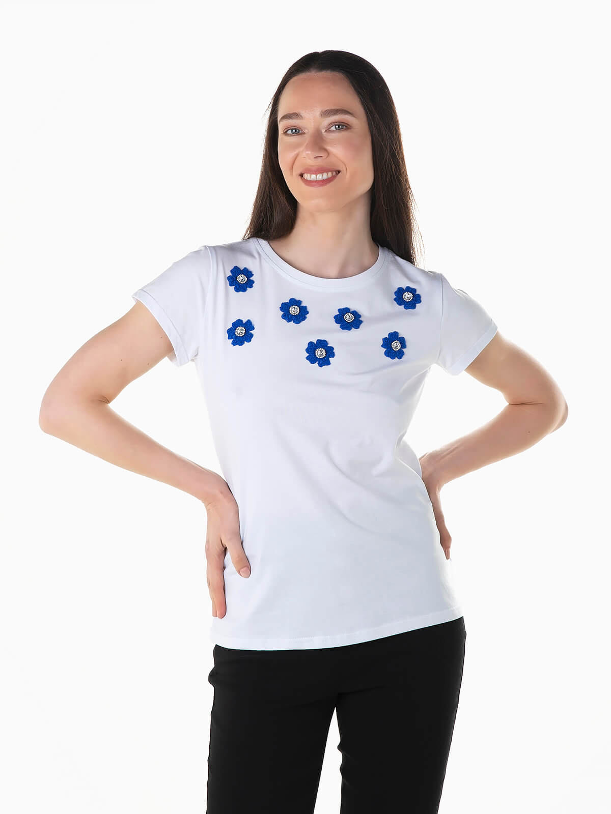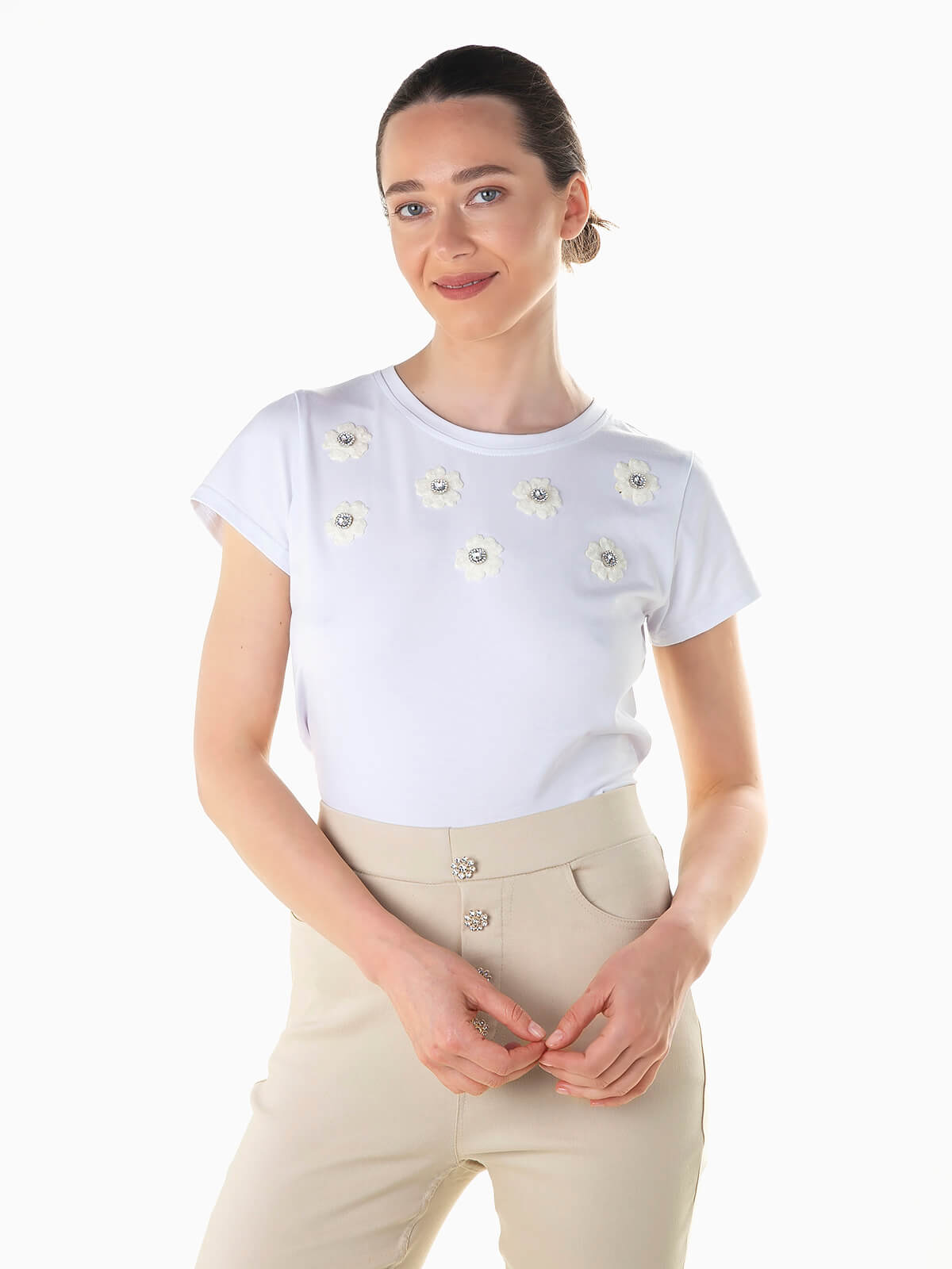 T-shirt branca manga curta com flores e pedras brilhantes aplicadas. T-shirt para senhora com decote redondo.