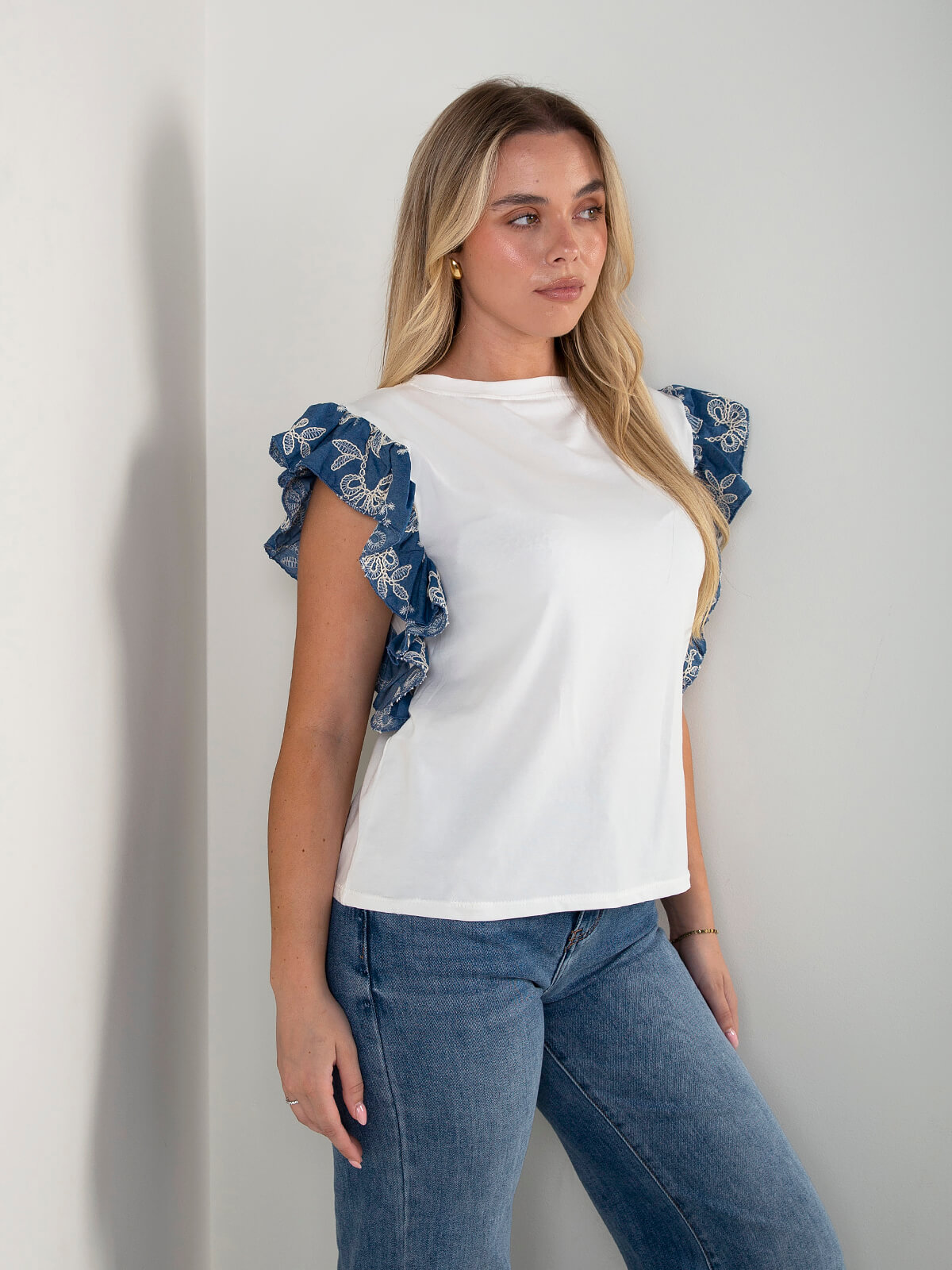 T-shirt branca com folhos em ganga bordada nas mangas. modelo confortável e atual, ideal para looks de dia a dia com um toque diferenciador.