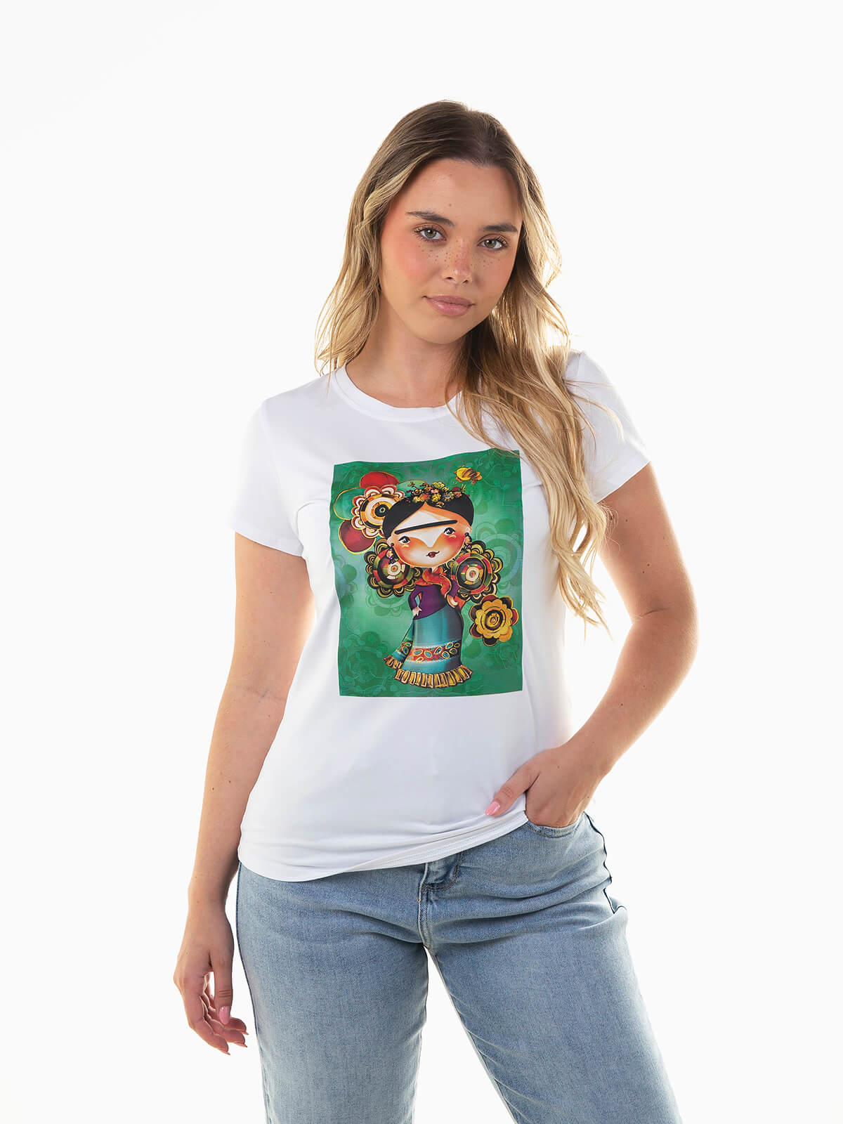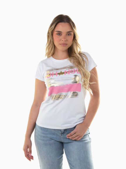 T-shirt branca com imagem que traz um toque doce e original ao visual, perfeita para quem gosta de peças com personalidade. T-shirt manga curta com decote redondo.