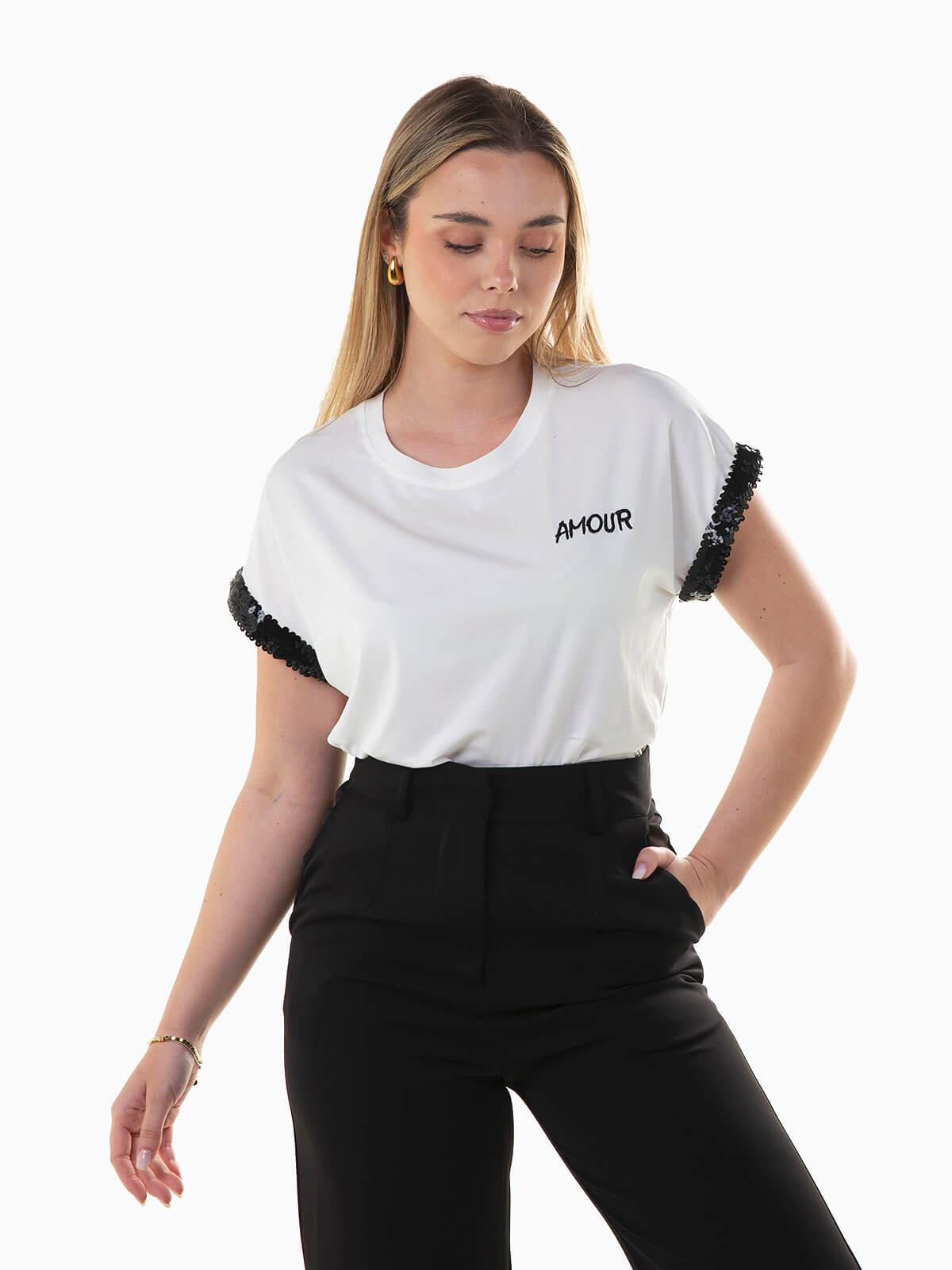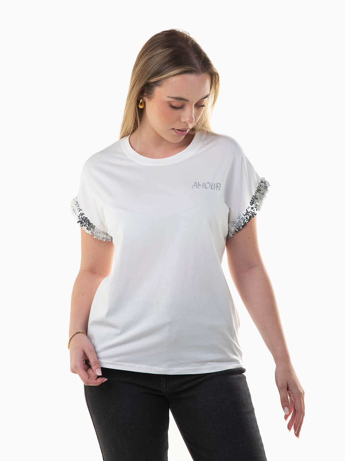 T-shirt branca de manga curta com lantejoulas aplicadas nas extremidades. T-shirt para mulher com letras bordadas no peito e decote redondo.