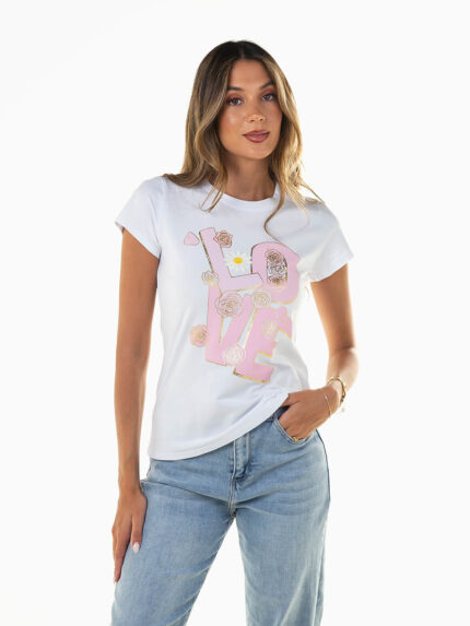 T-shirt branca de manga curta com bordados e aplicações de lantejoulas no peito. Modelo com decote redondo, que combina conforto com um detalhe feminino e delicado.