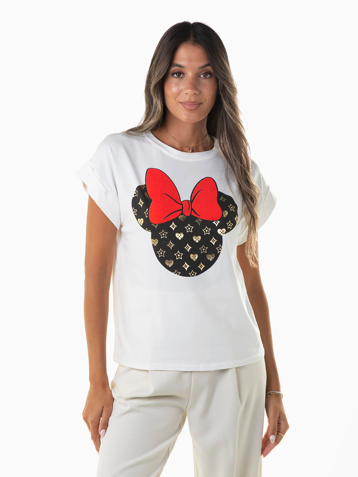 T-shirt branca com ilustração estampada. T-shirt para senhora com decote redondo. Altura da Modelo: 175 cm | Tamanho: Tamanho Único