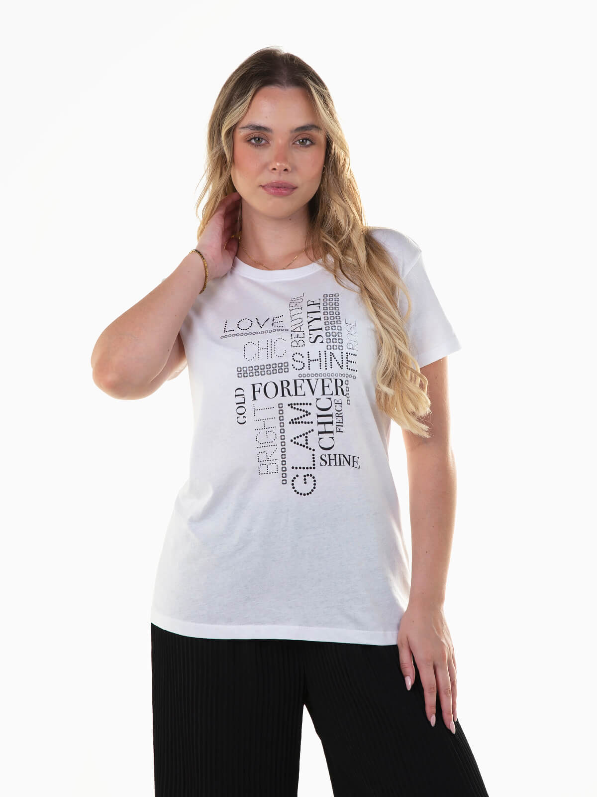 T-shirt branca de manga curta com estampado de letras para senhora. T-shirt 100% algodão com decote redondo.