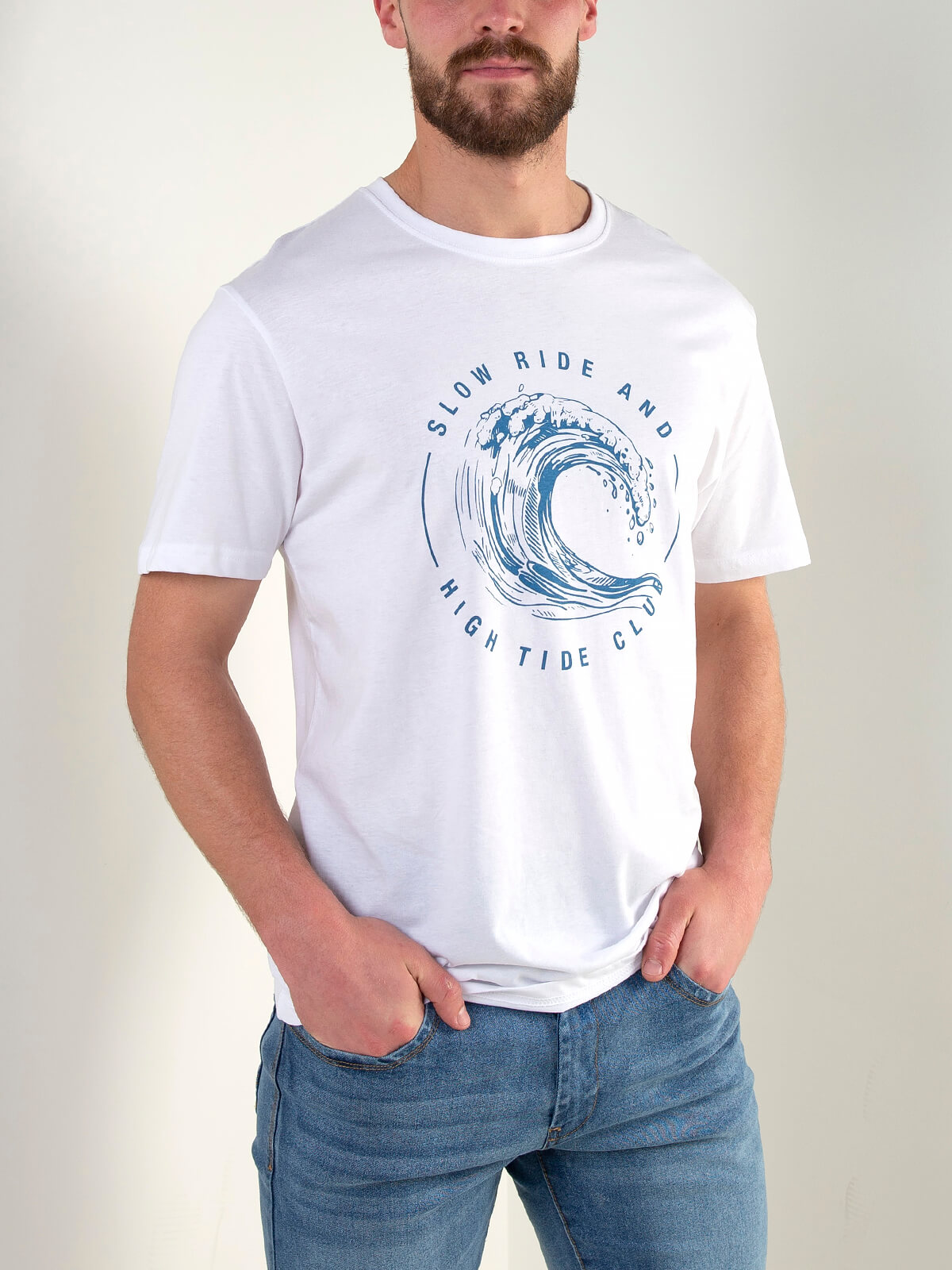 T-shirt branca de homem com manga curta e gola redonda. Modelo com estampado frontal inspirado no mar, ideal para looks casuais e descontraídos.