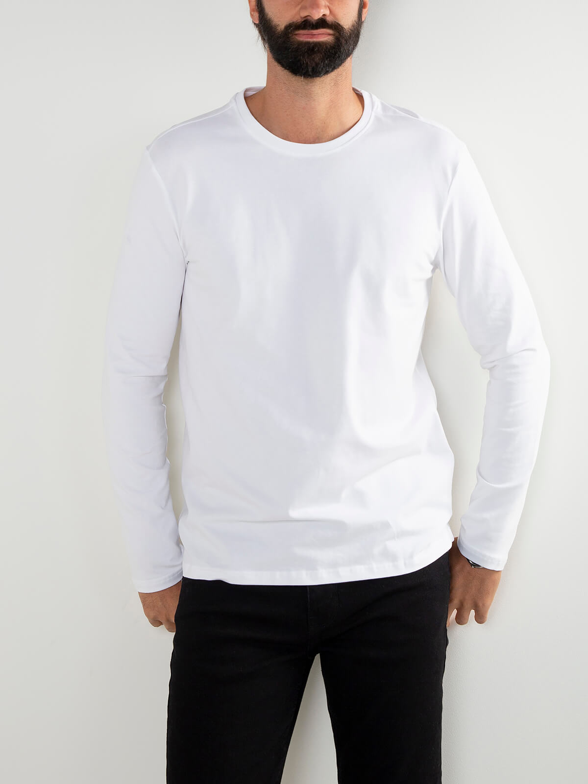 T-shirt branca de manga comprida para homem, com gola redonda e tecido confortável. Modelo versátil e intemporal, ideal para usar sozinho ou como base de looks de meia-estação e inverno.