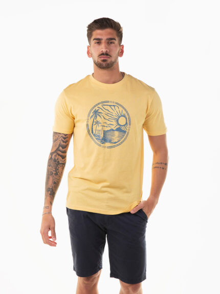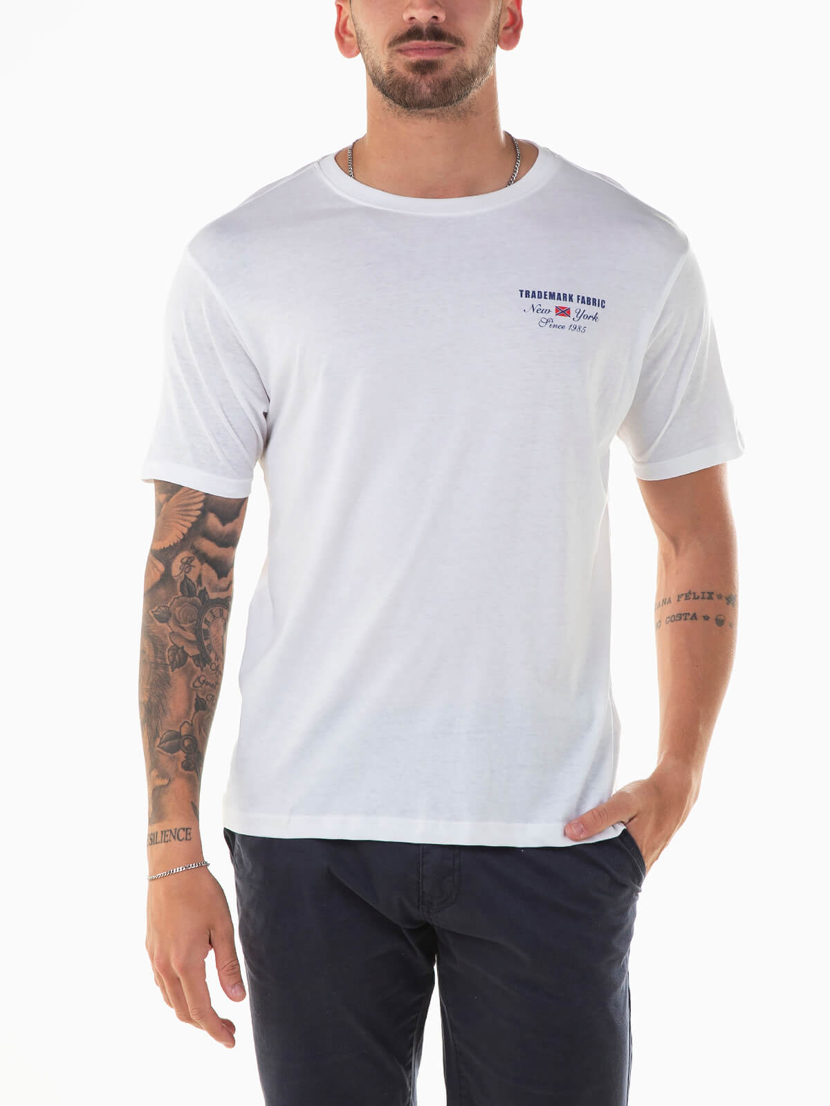 T-shirt branca de manga curta para homem. T-shirt 100% algodão com gola redonda e letras estampadas no peito.