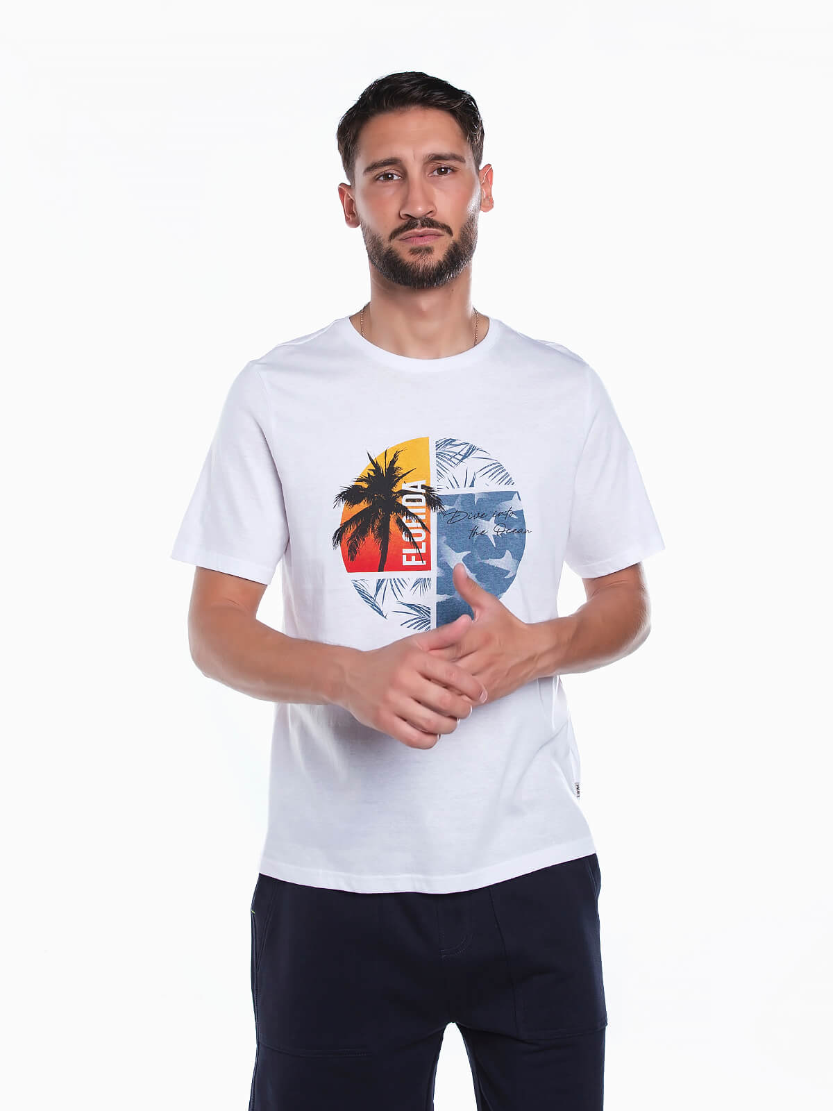 T-shirt branca de manga curta com círculo estampado no peito. T-shirt em tecido 100% algodão com gola redonda.