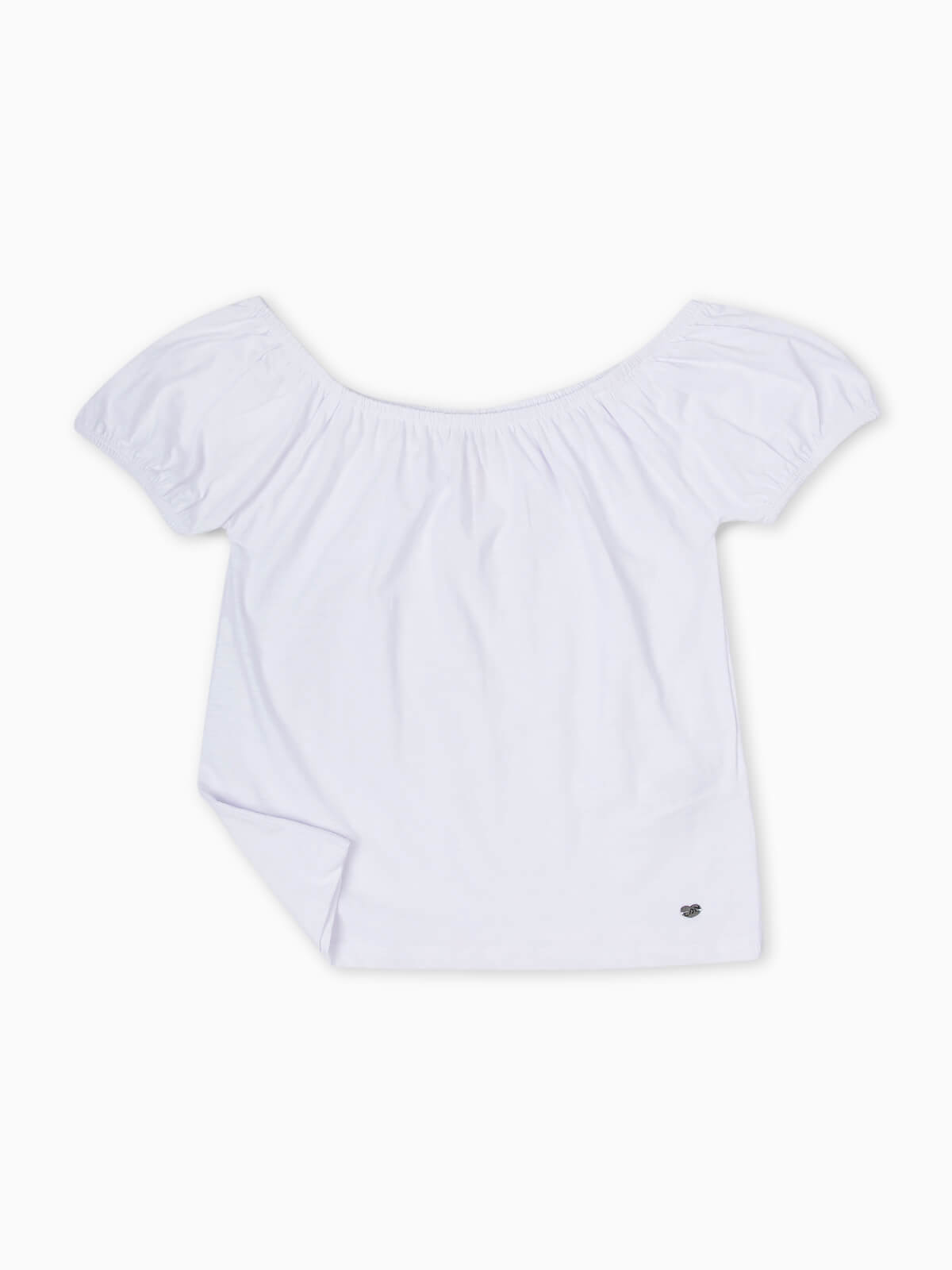 T-shirt branca de manga curta com ombros descobertos para menina. T-shirt em tecido 100% algodão com elástico ao longo de decote e manga.