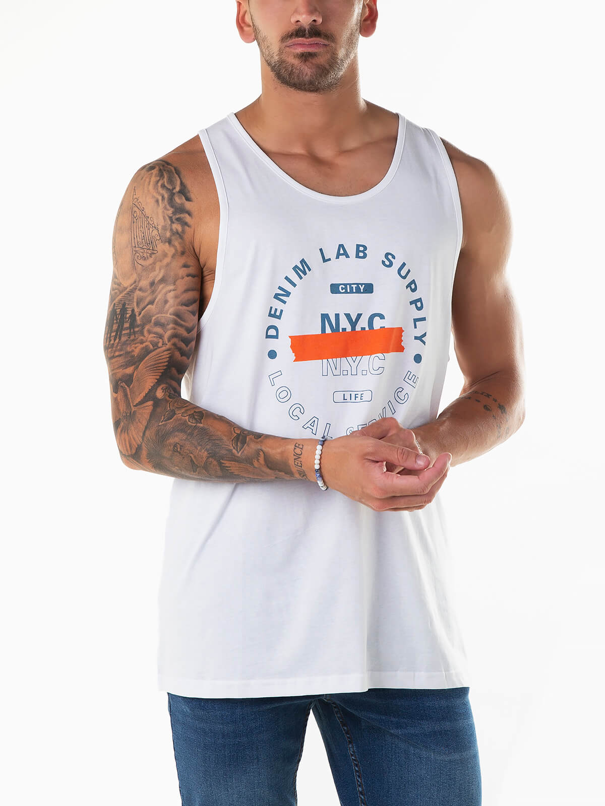 T-shirt branca sem mangas para homem com estampado no peito. T-shirt tank com gola redonda.