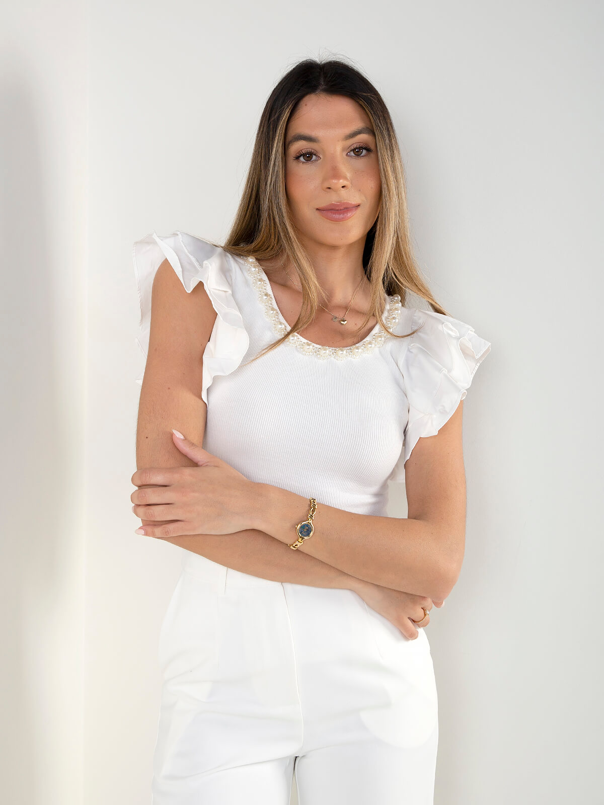 T-shirt canelada com mangas de folhos e detalhe de pérolas no decote. Modelo sem mangas, confortável e ideal para looks de verão.