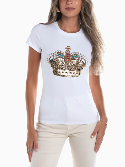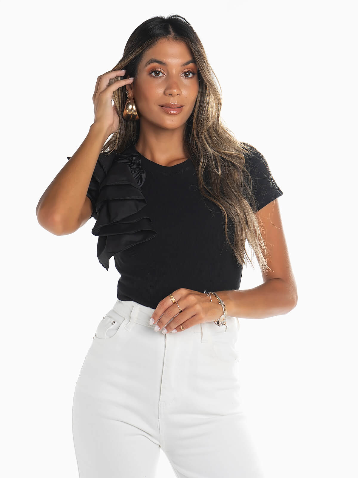 T-shirt de manga curta em malha canelada combinada com folhos e flores aplicados no ombro. T-shirt com decote redondo.