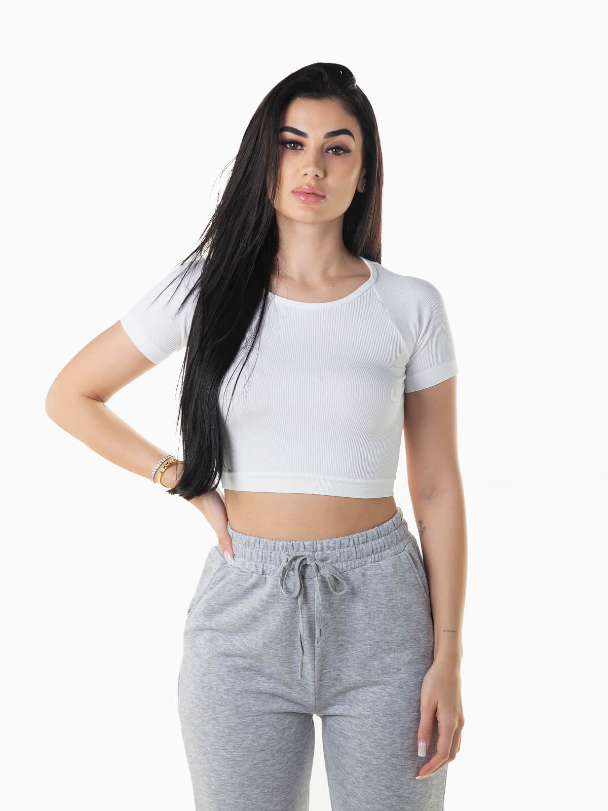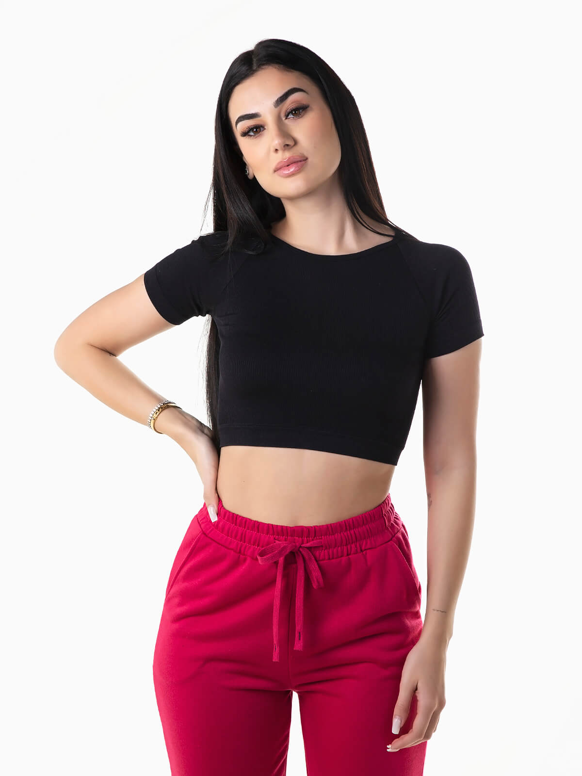 T-shirt em tecido elástico e canelado para senhora. T-shirt cropped de manga curta raglan com decote redondo.