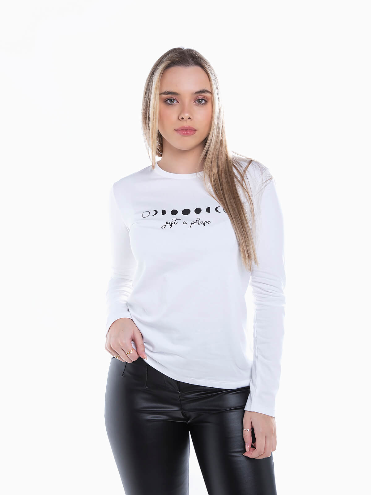 T-shirt cardada de manga comprida para senhora. T-shirt em tecido de algodão com estampado de letras e fases de lua. Decote redondo.