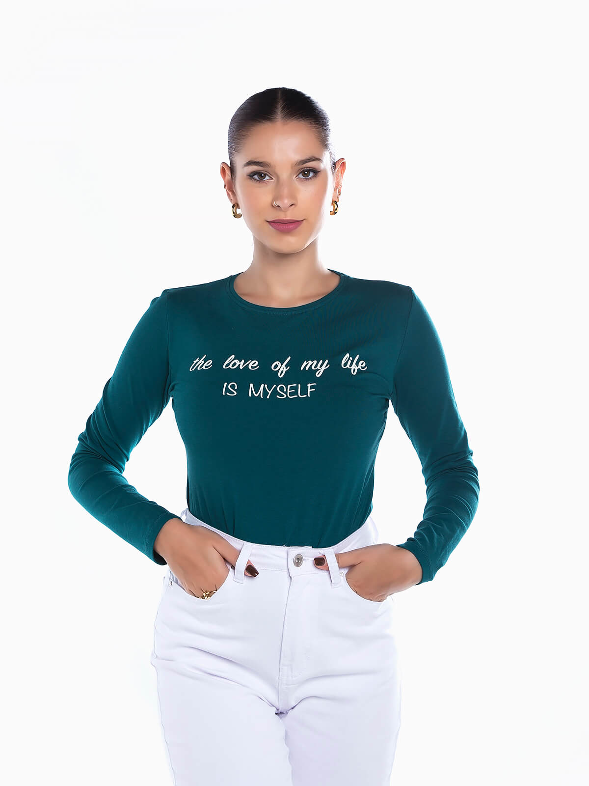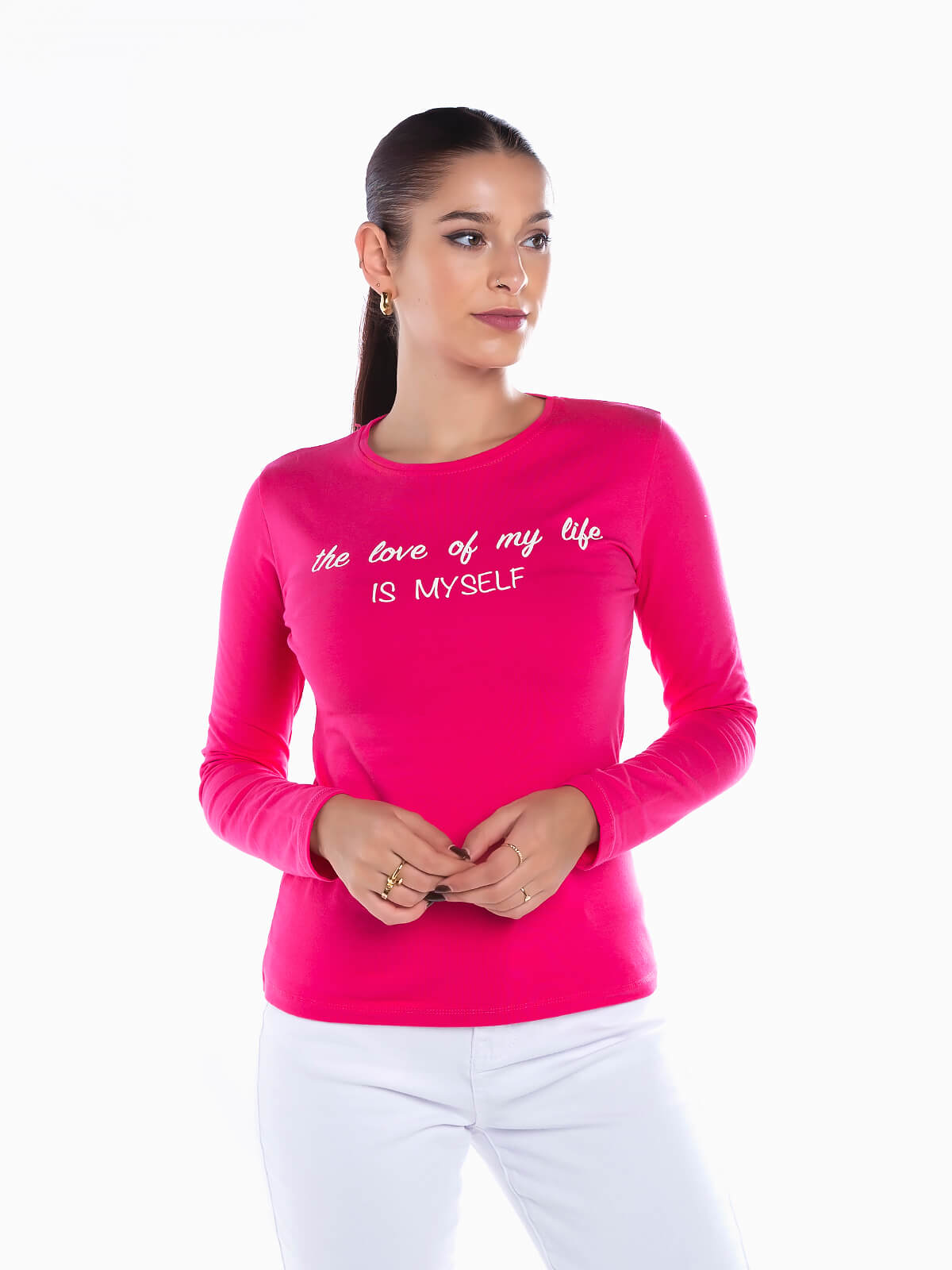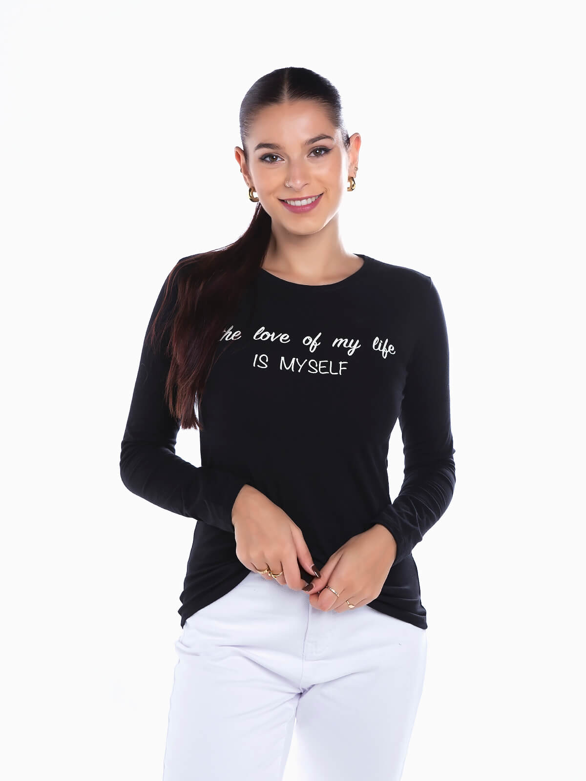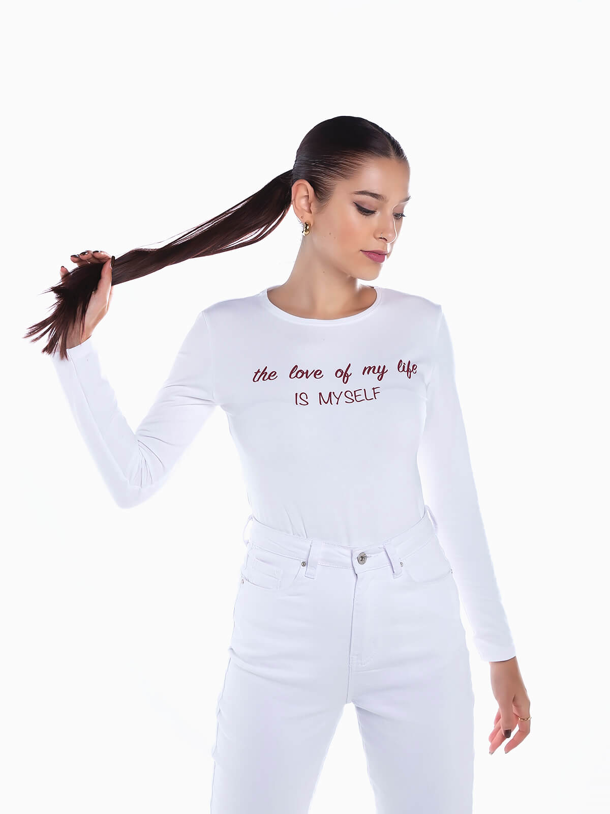T-shirt cardada de manga comprida com estampado de letras no peito. T-shirt com decote redondo.