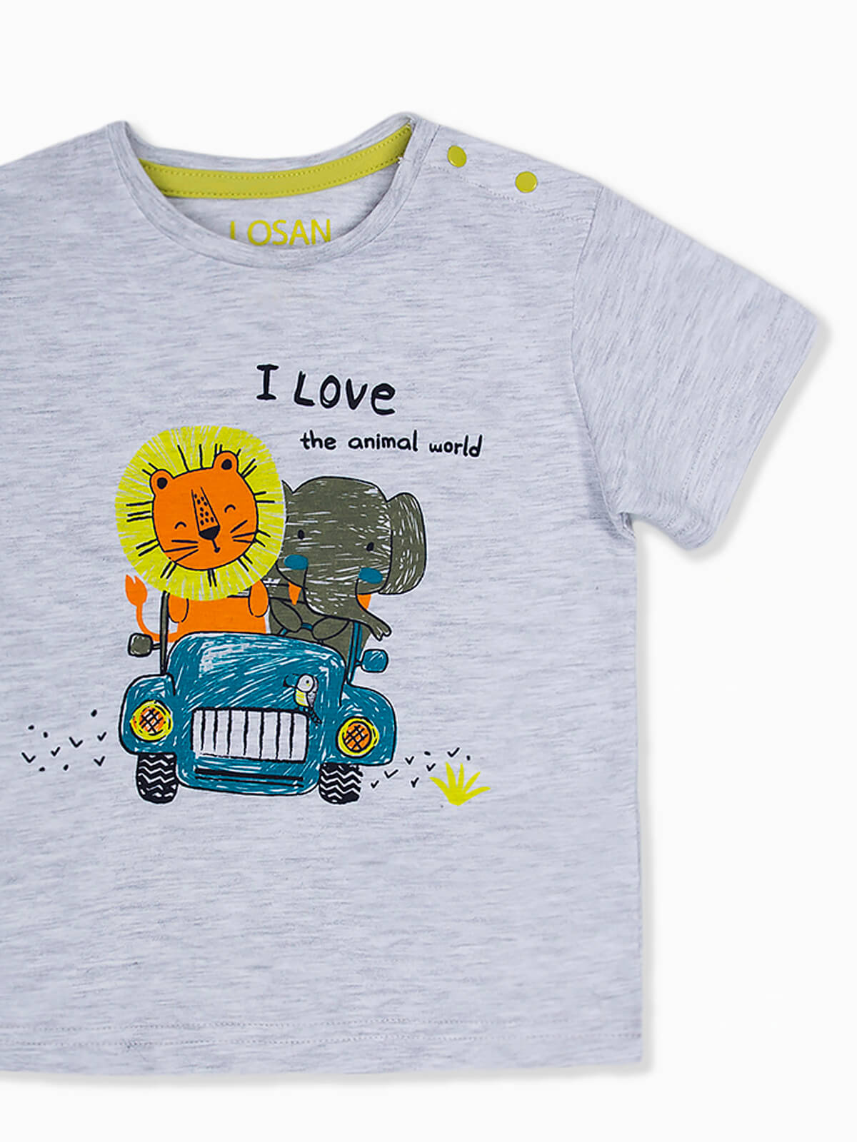 T-shirt cinza claro com manga curta para bebé menino. T-shirt de gola redonda com aperto de 2 botões de pressão.