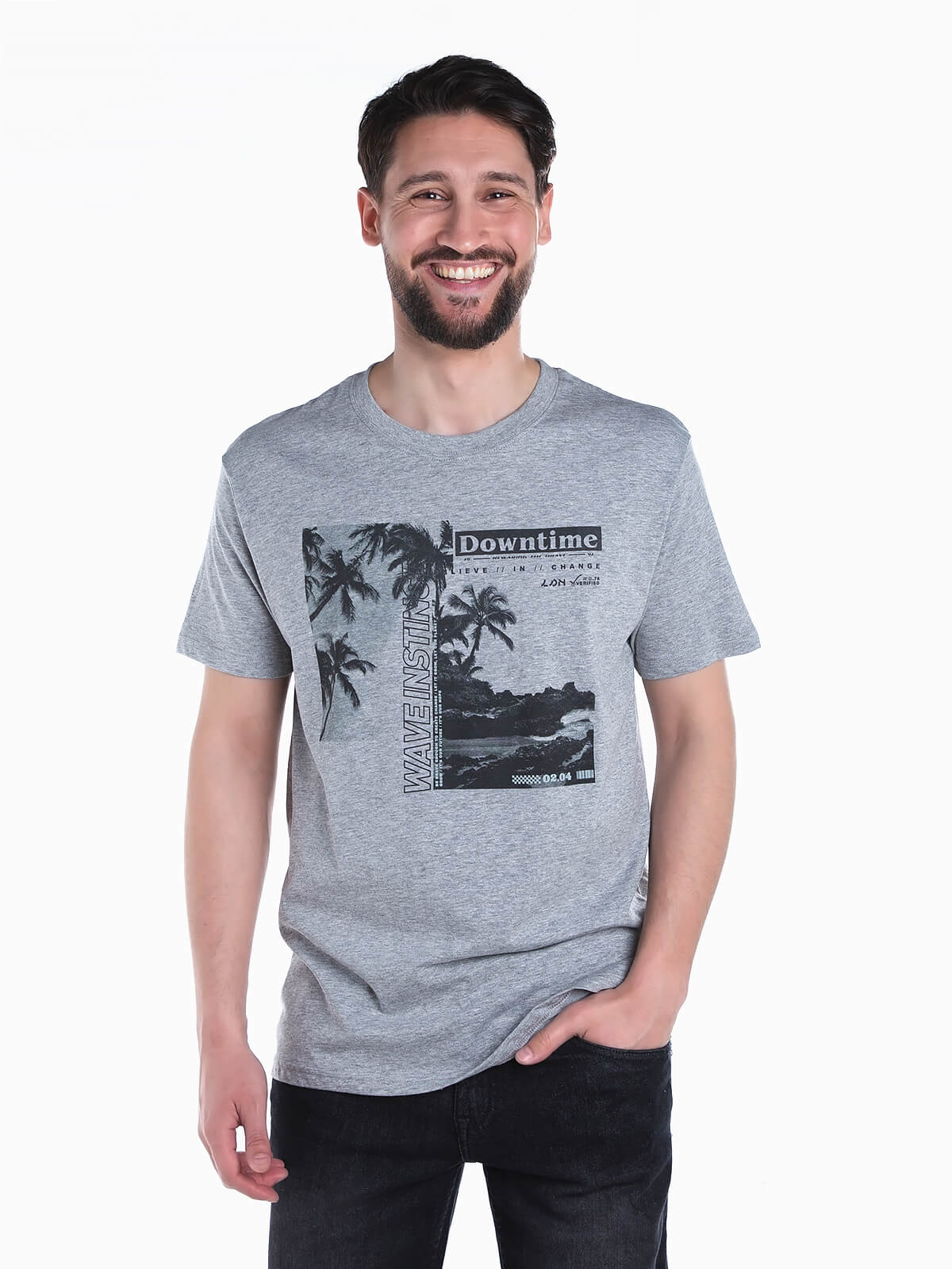 T-shirt cinza de manga curta para homem. T-shirt mesclada em tecido de algodão com estampado. Gola redonda.
