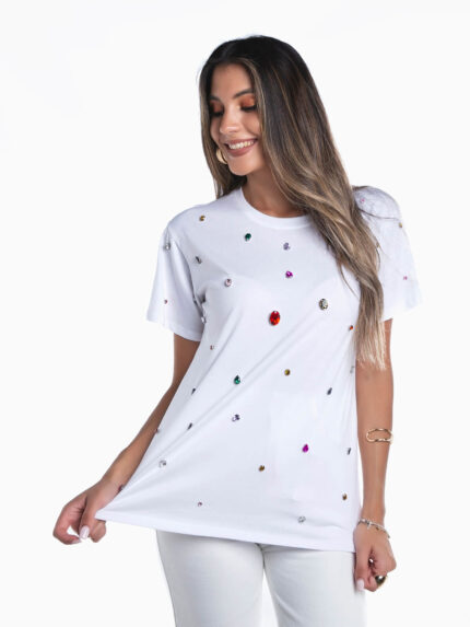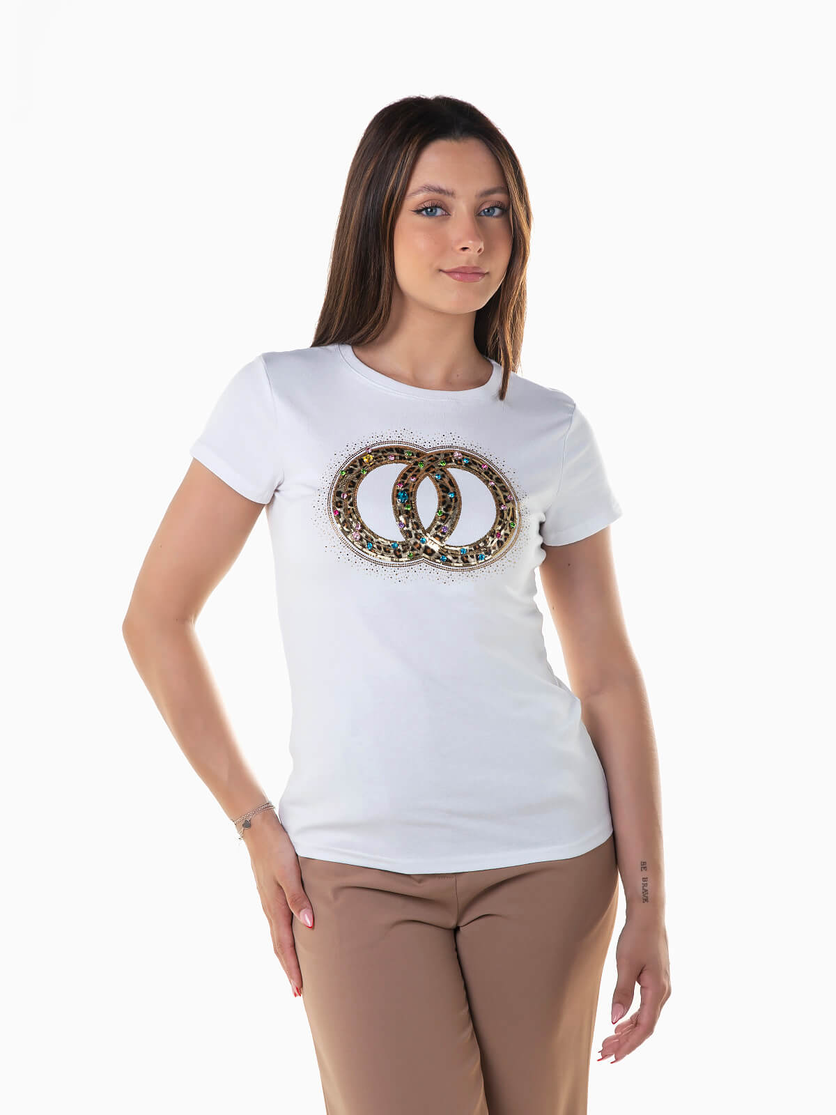 T-shirt com círculos em animal print e brilhos aplicados. T-shirt para senhora com manga curta e decote redondo.