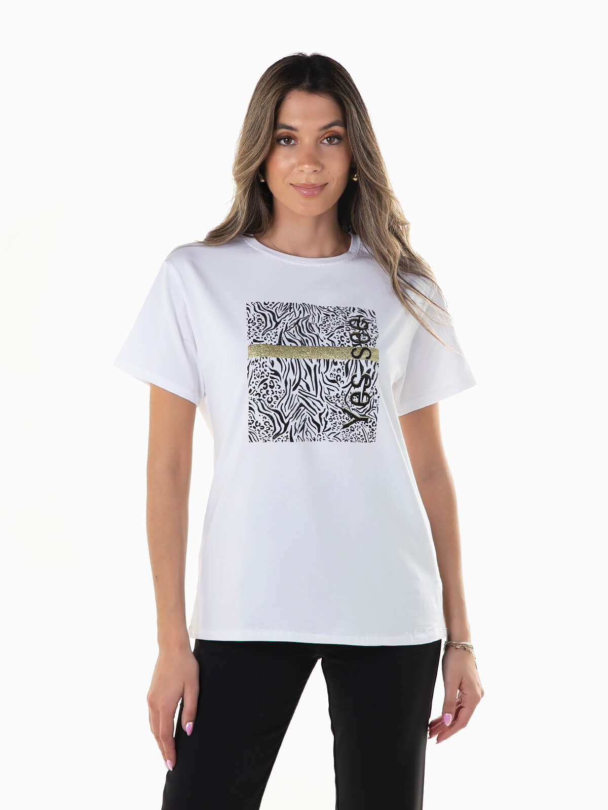 Início Mulher T-shirts T-shirt com animal print manga curta