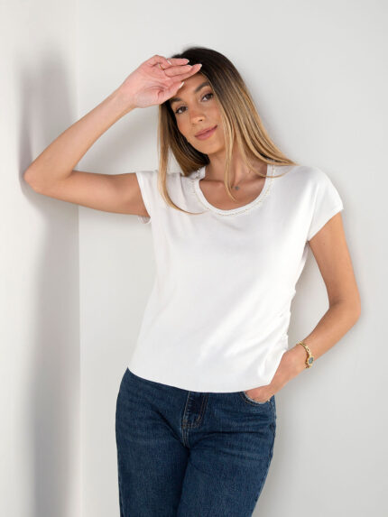 T-shirt de manga curta com aplicações em crochet na parte frontal que destacam a peça com um toque diferenciador. Modelo com corte regular e decote redondo, fácil de conjugar em looks casuais do dia a dia.