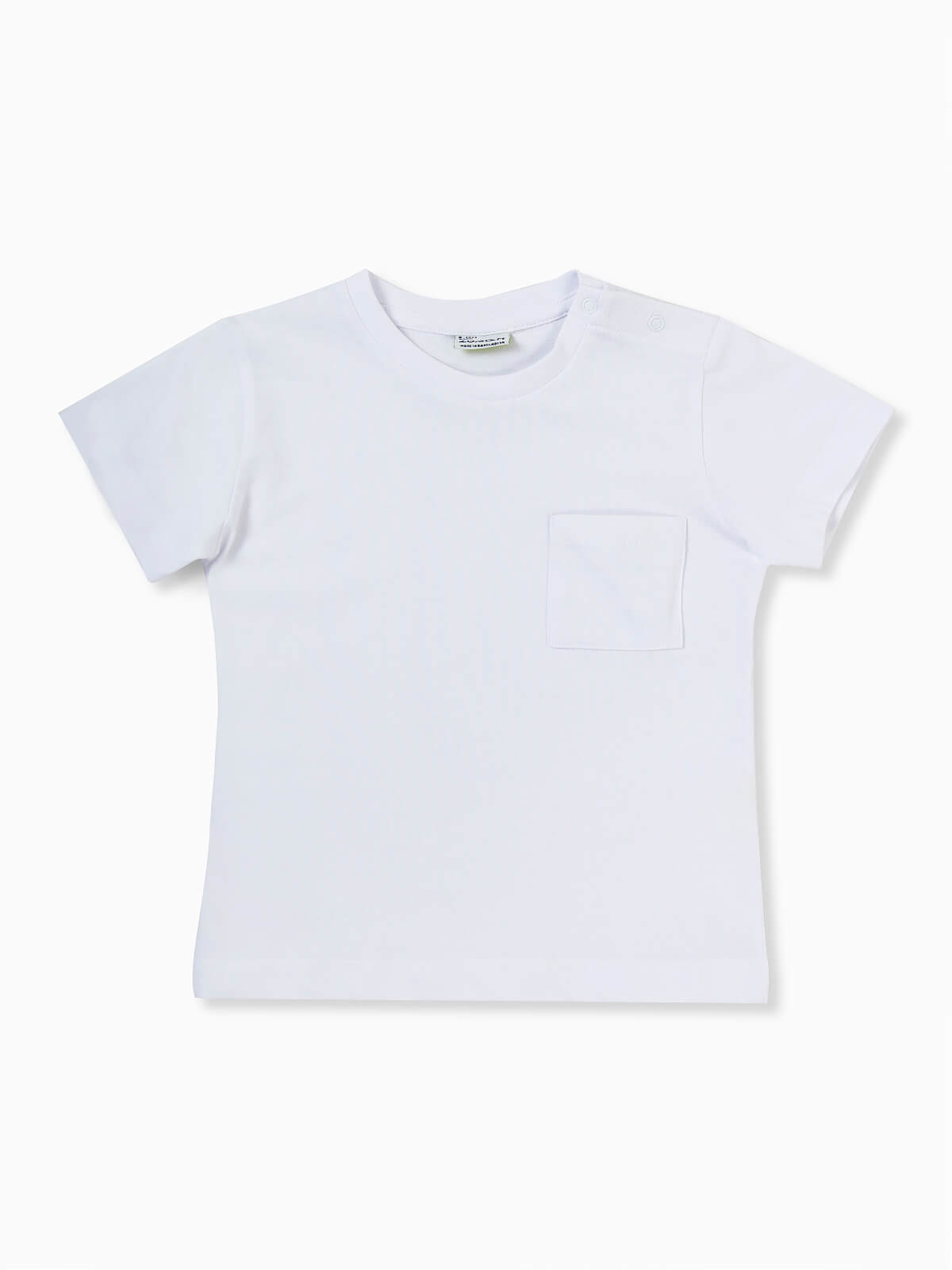 T-shirt com bolso no peito para bebé menino. T-shirt de manga curta com gola redonda.