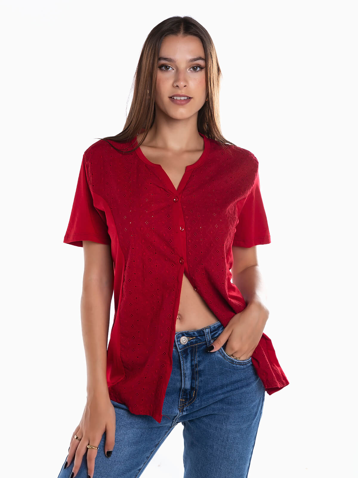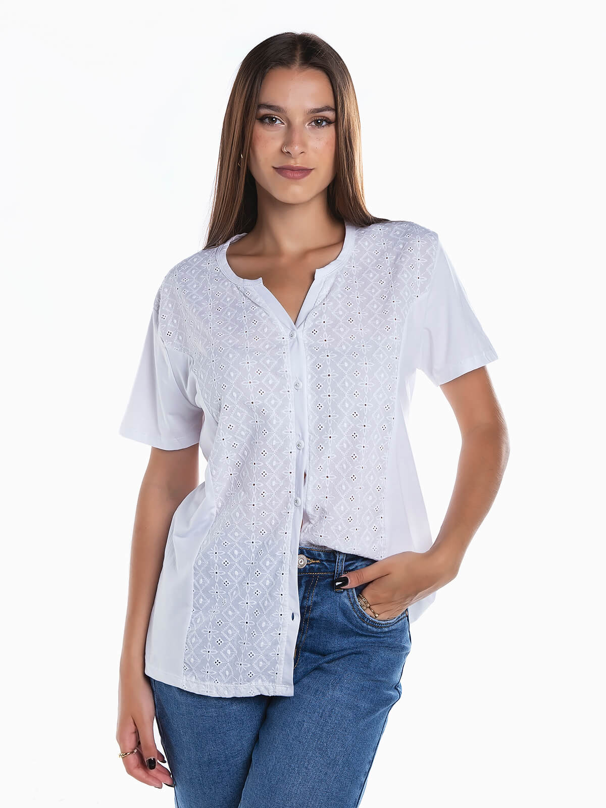 T-shirt combinada com bordado inglês na parte frontal e aperto de botões. T-shirt manga curta com decote em V.