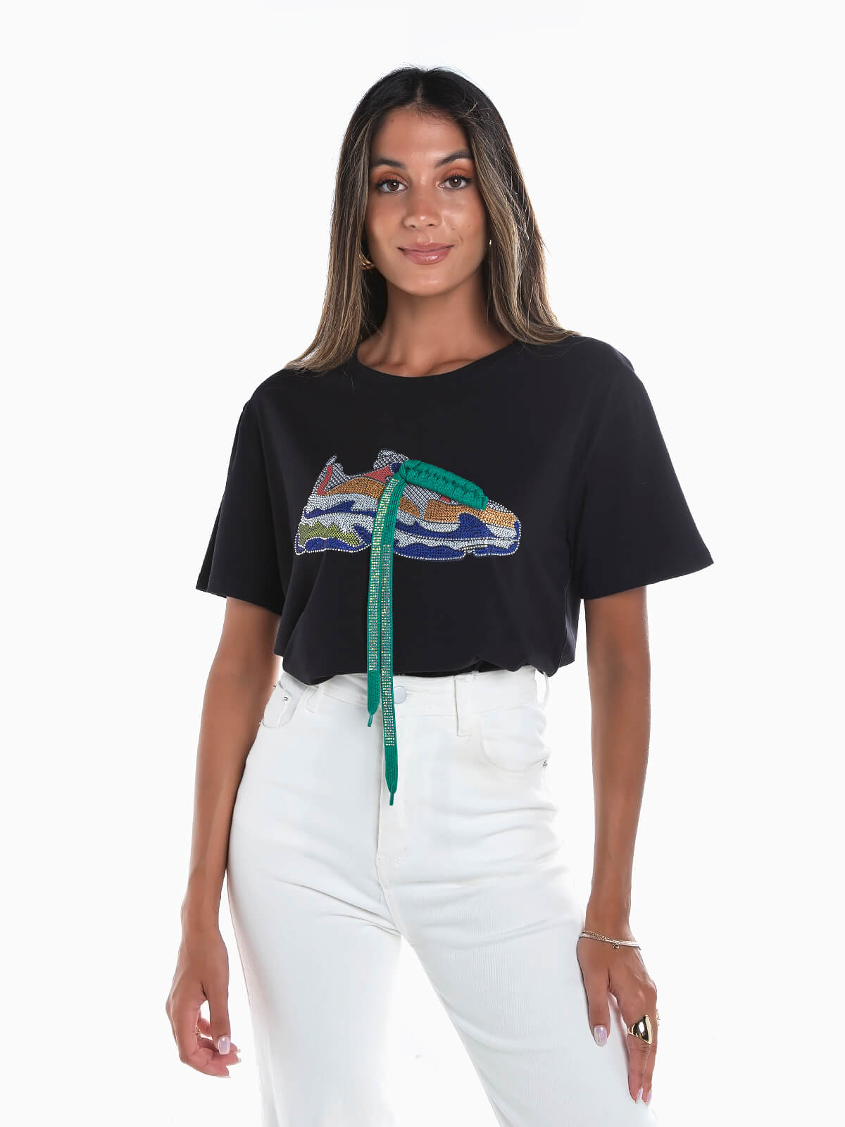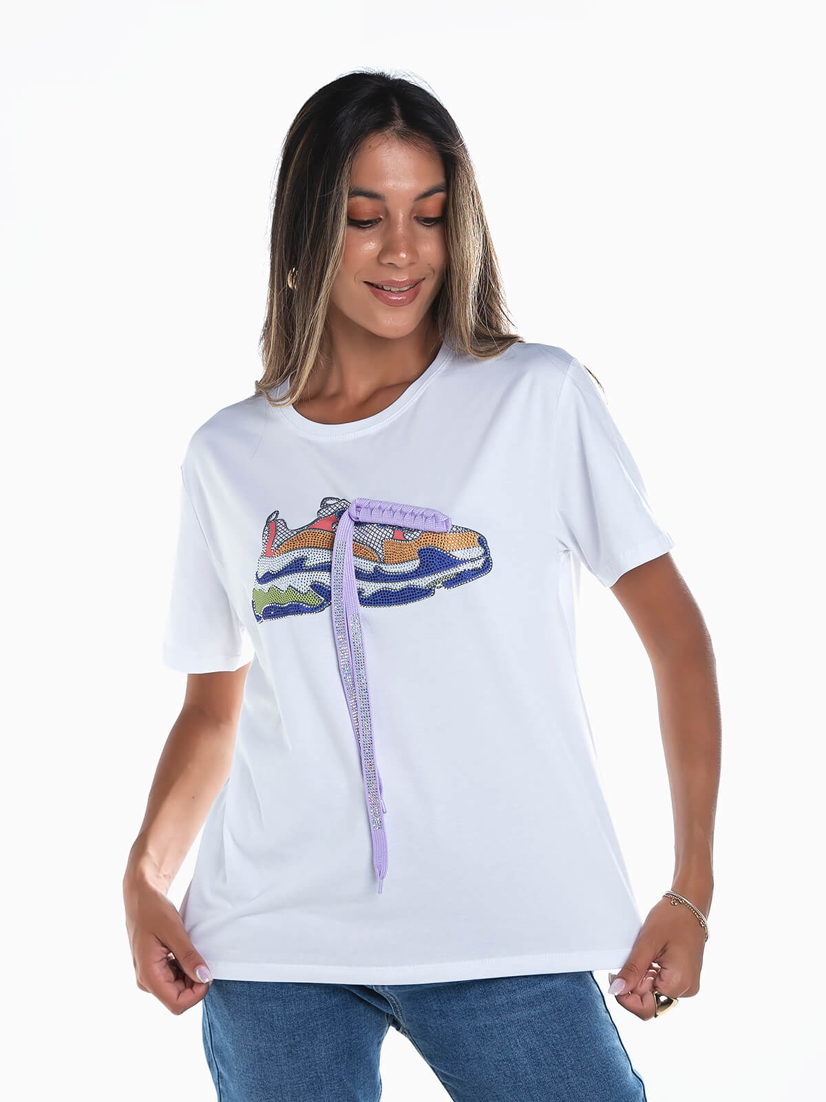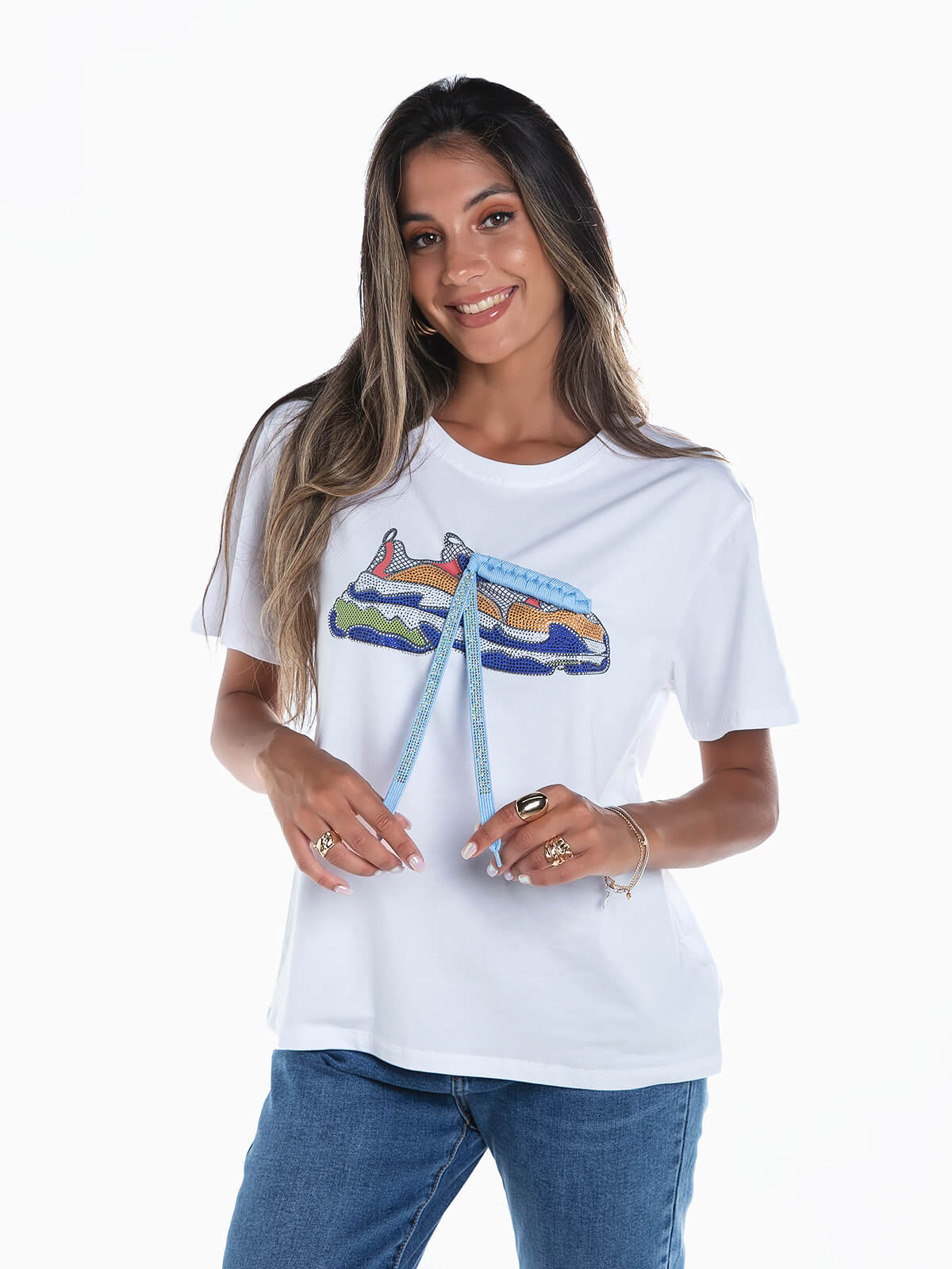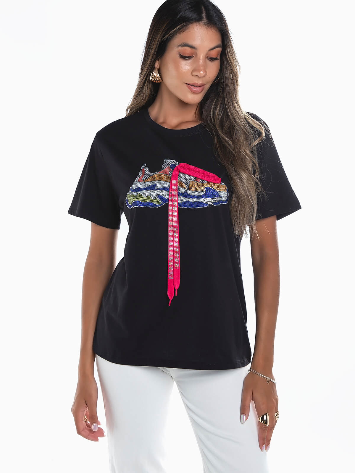 T-shirt com estampado de sapatilha em brilhantes para senhora. T-shirt manga curta com pormenor de cordão bordado. Decote redondo.