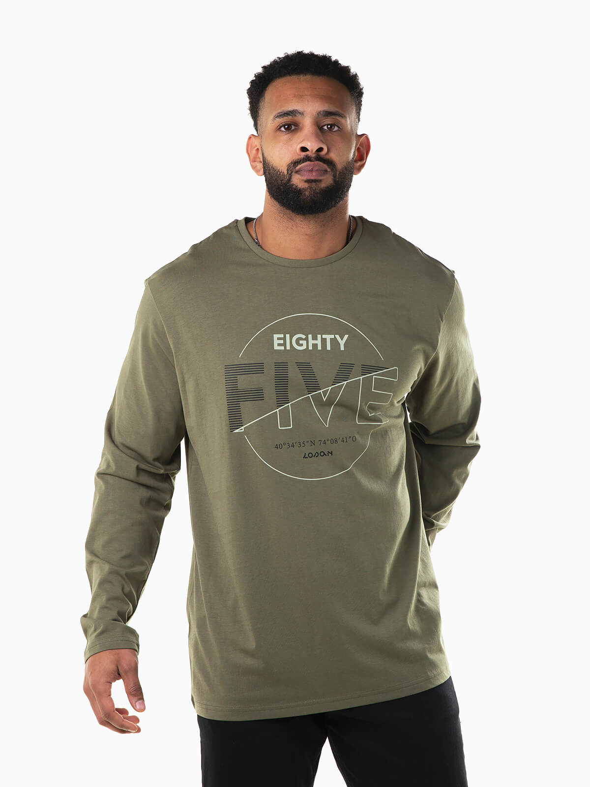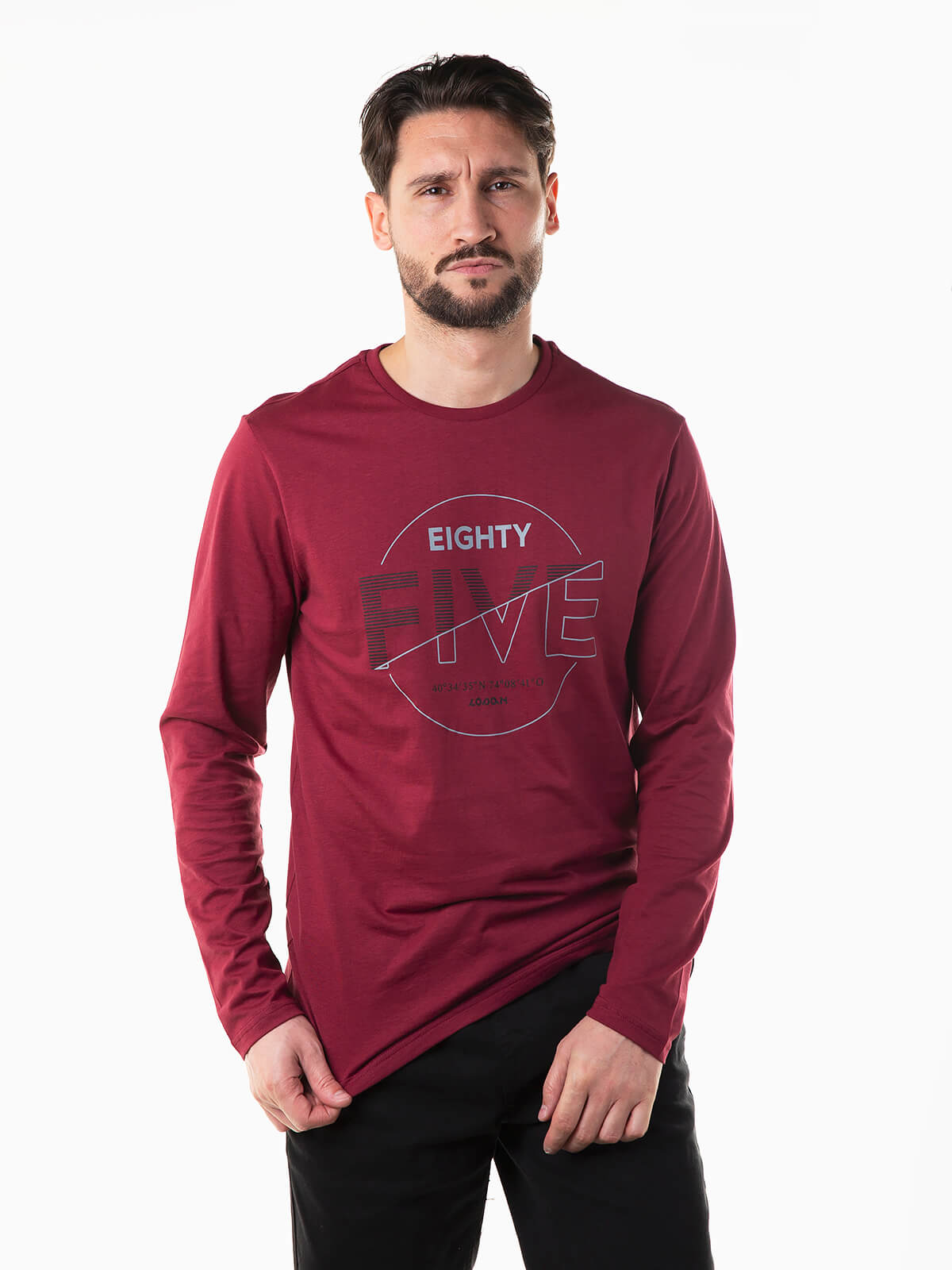 T-shirt de manga comprida com círculo estampado no peito. Long Sleeve para homem com gola redonda.