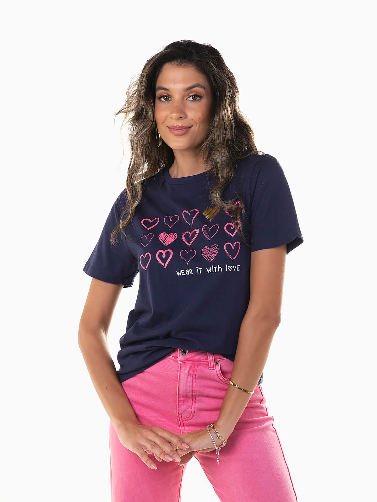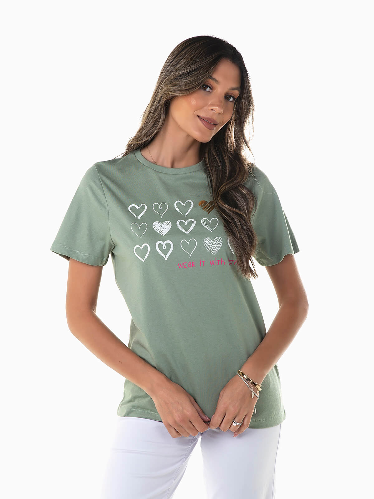 T-shirt de manga curta com corações estampados. T-shirt para senhora com decote redondo.