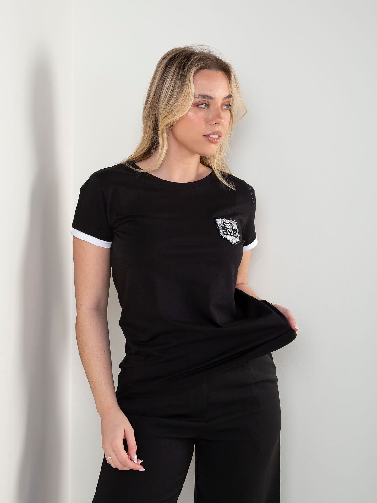 T-shirt de manga curta com decote redondo e detalhe bordado frontal. Uma peça versátil para looks casuais com jeans ou calças.