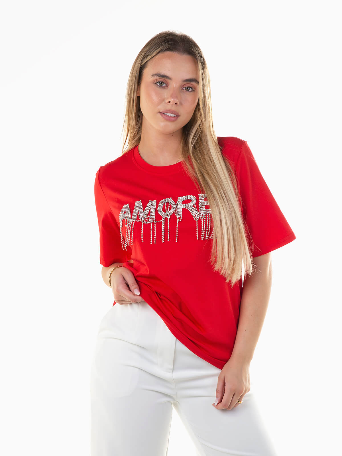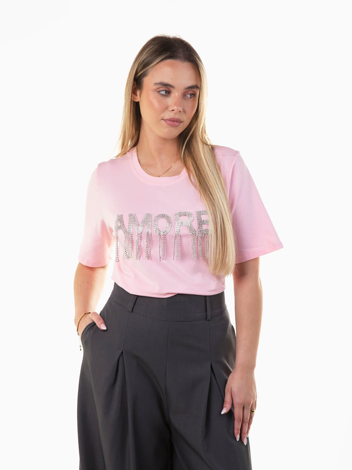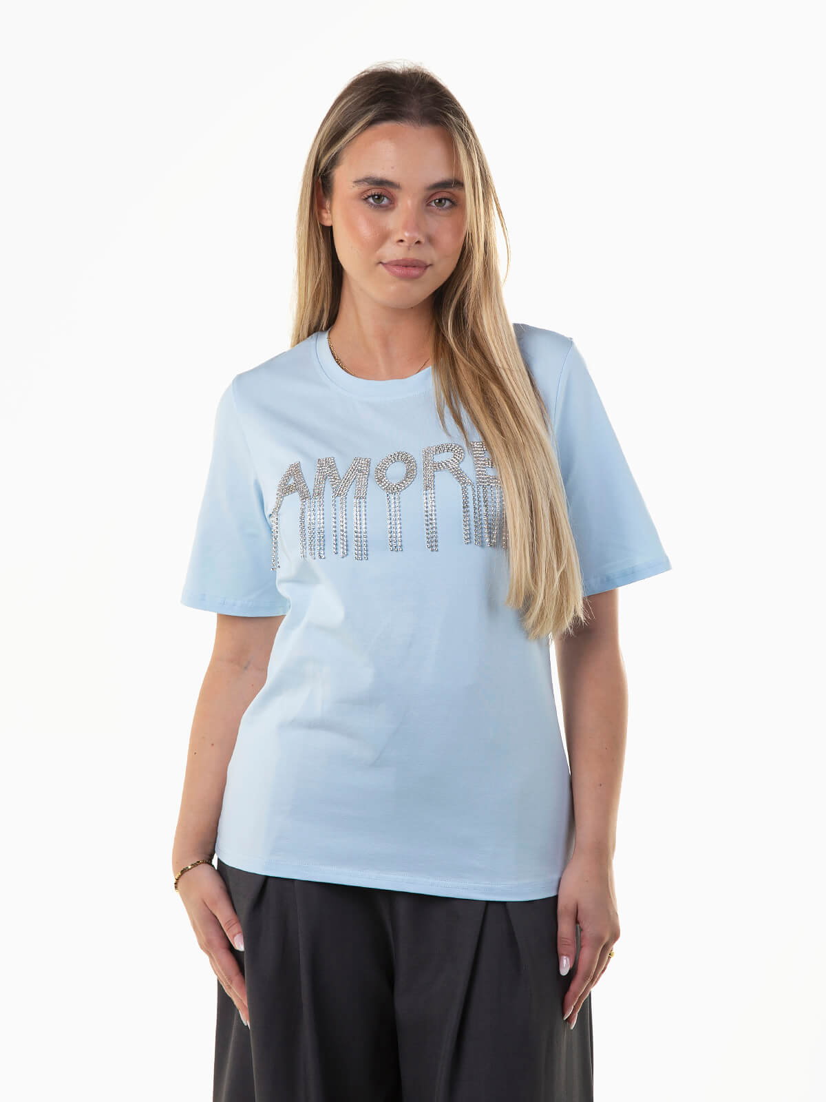 T-shirt manga curta disponível em várias cores, com detalhe em strass no peito. Decote redondo. Modelo feminino delicado e cheio de charme, perfeito para adicionar brilho e personalidade ao look do dia a dia.
