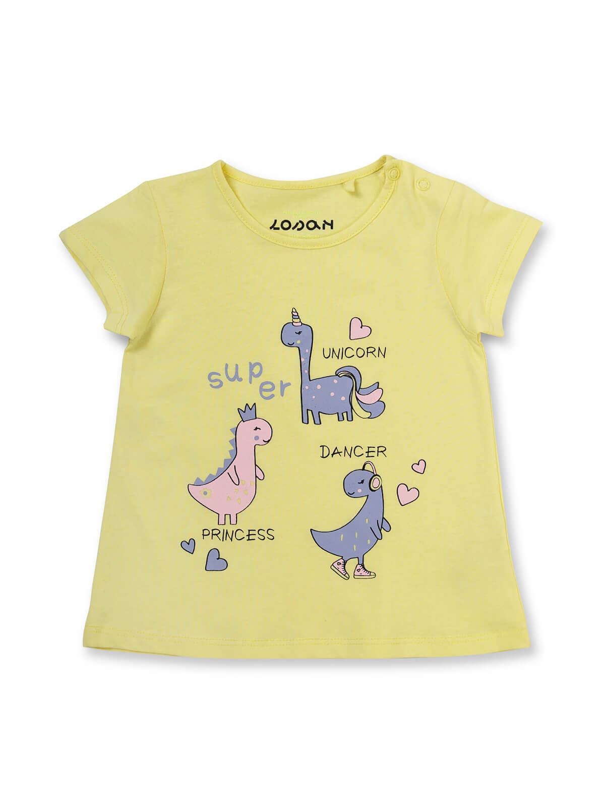 T-shirt manga curta com dinossauros estampados para bebé menina. T-shirt com decote redondo e aperto de botões de pressão.