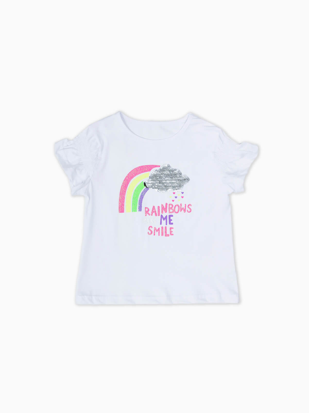 T-shirt com estampado de arco-íris em brilho e nuvem em lantejoulas. T-shirt de manga curta com folho de gola redonda.