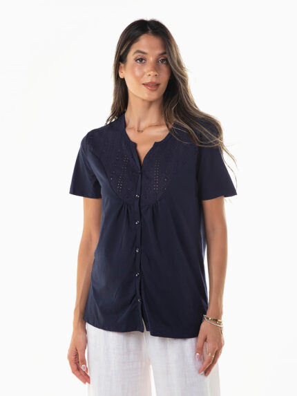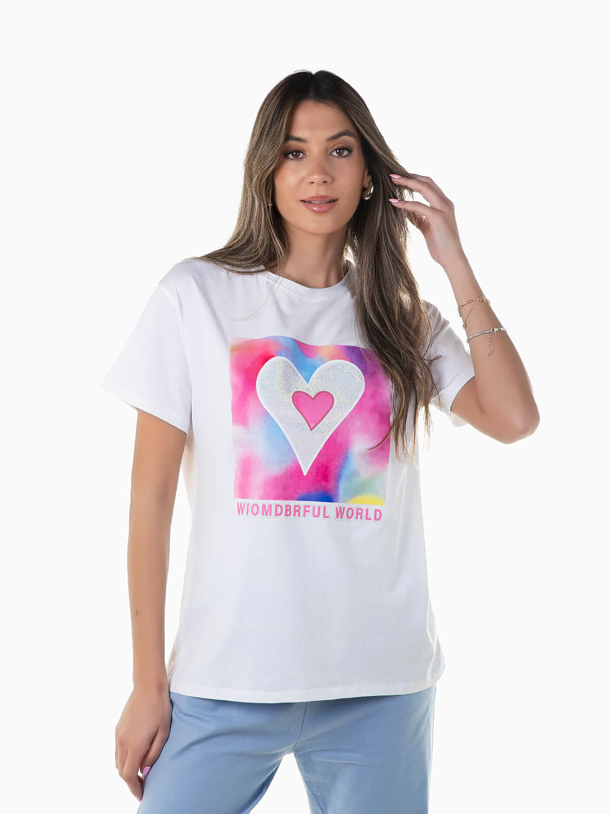 T-shirt com estampado coração brilhante e pormenores tie dye. T-shirt manga curta para senhora com decote redondo.