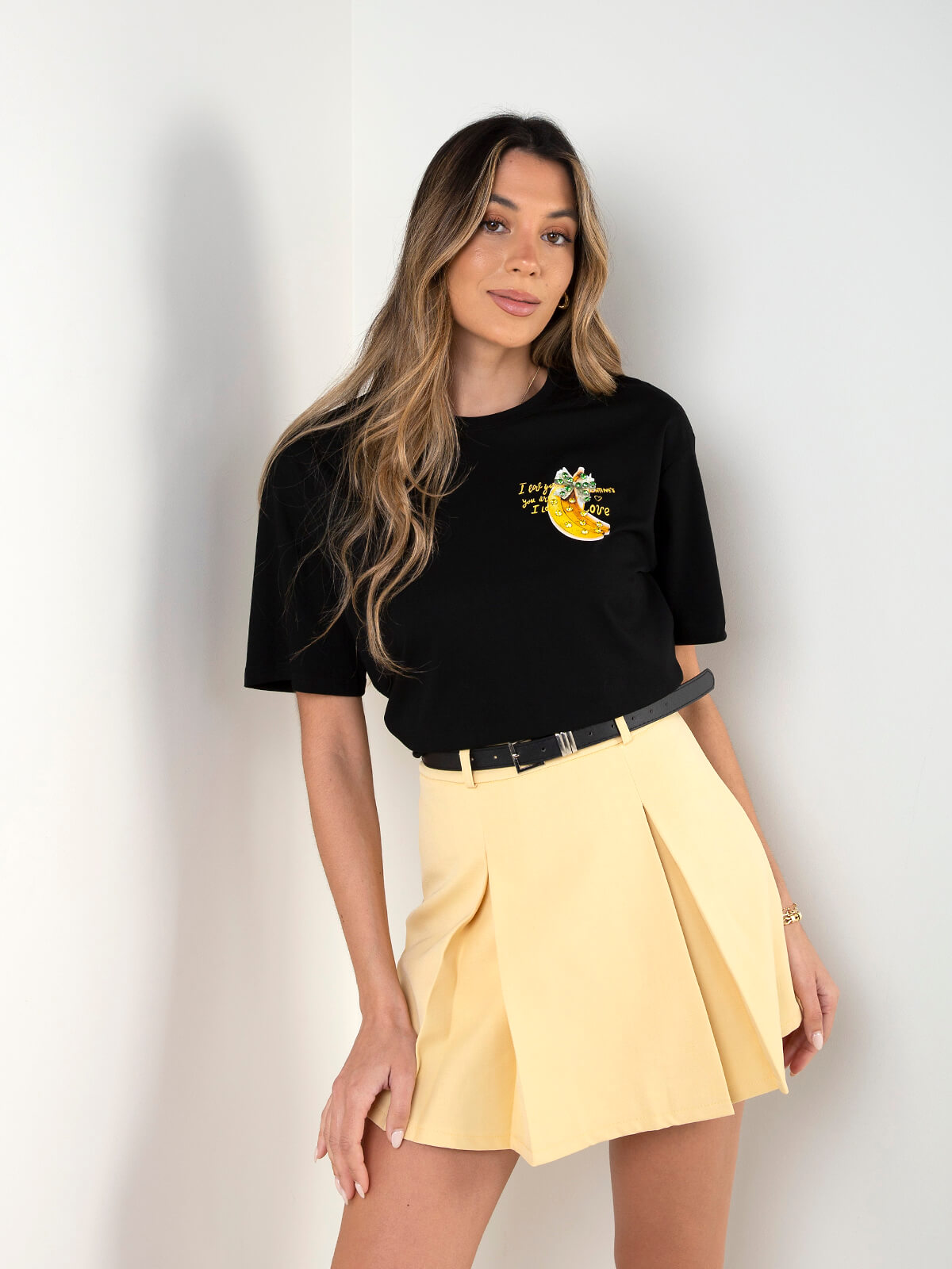 T-shirt com estampado decorativo e aplicações brilhantes. Modelo casual com detalhe nas costas, ideal para looks descontraídos e modernos.