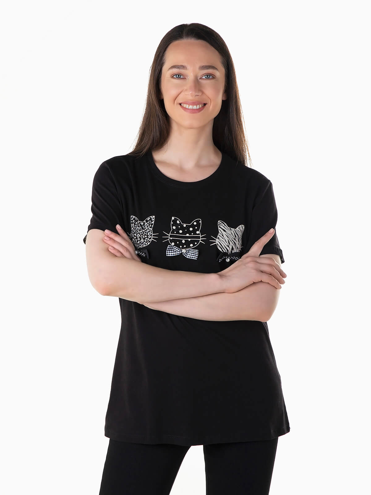 T-shirt com estampado de gatos e aplicações de laços e brilhos. T-shirt manga curta com decote redondo.
