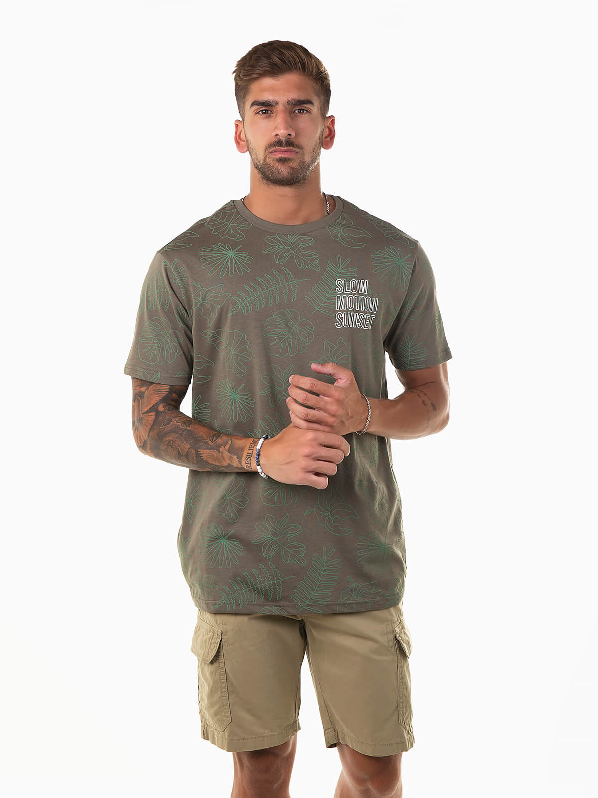 T-shirt com estampado de folhas e letras para homem. T-shirt manga curta confecionada em tecido 100% algodão para maior conforto. Gola redonda.