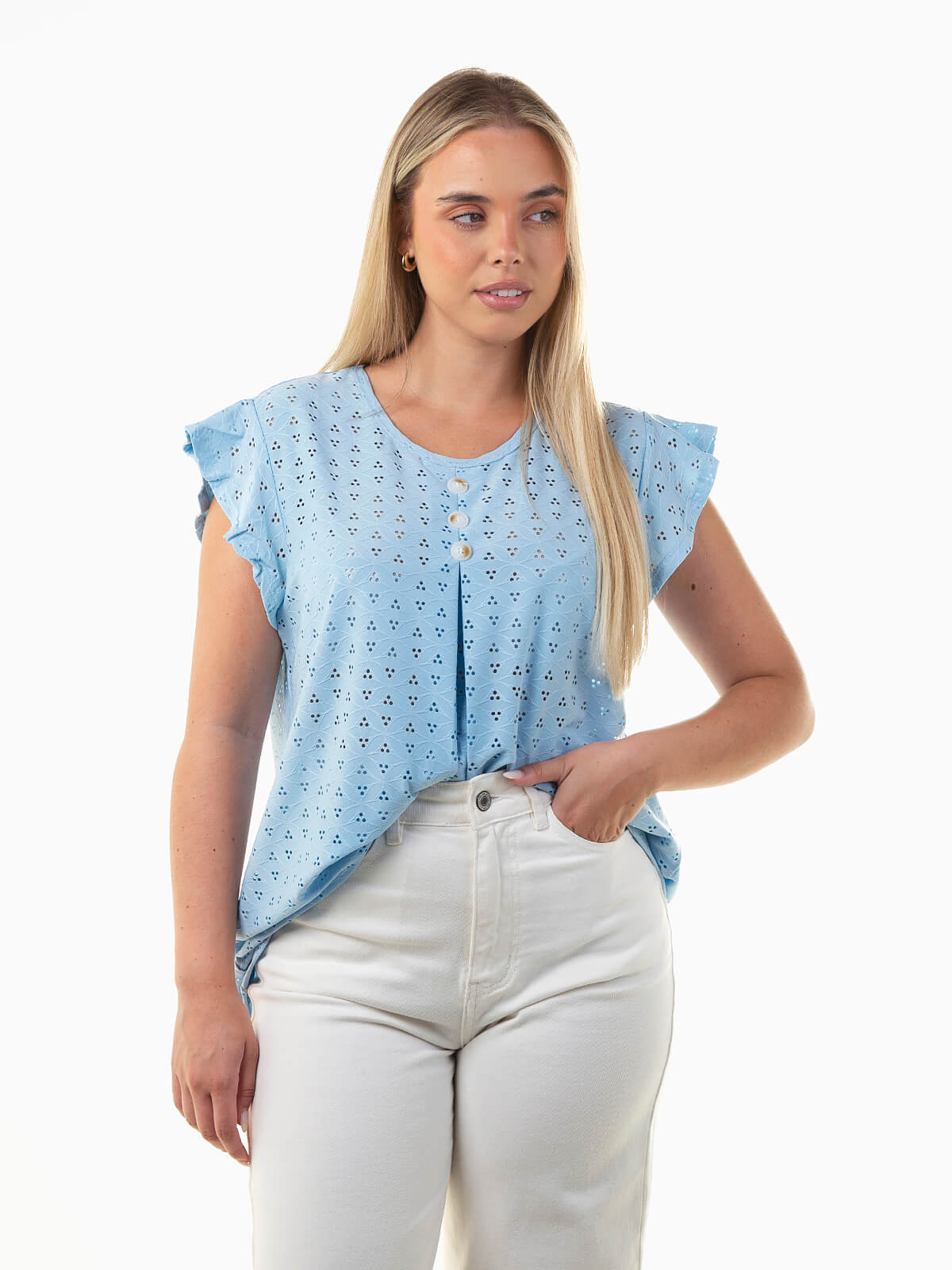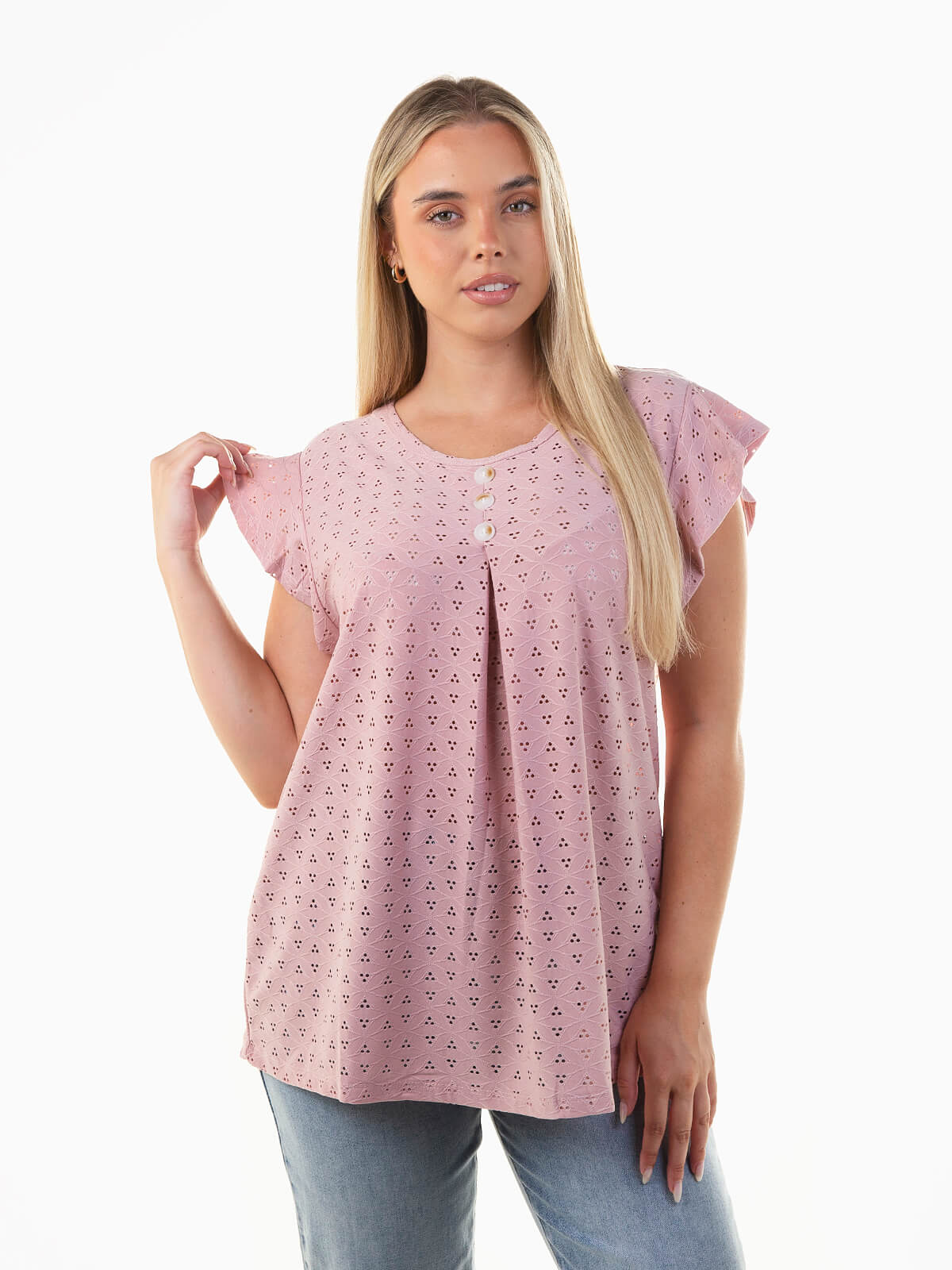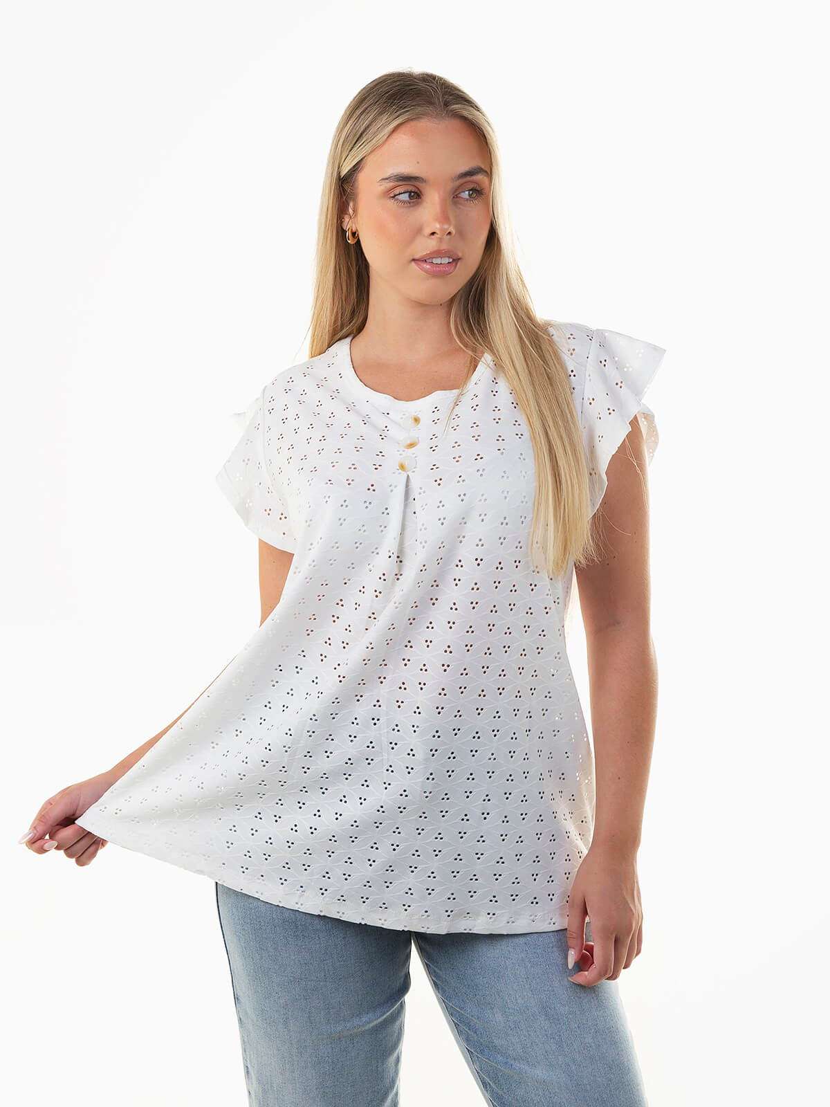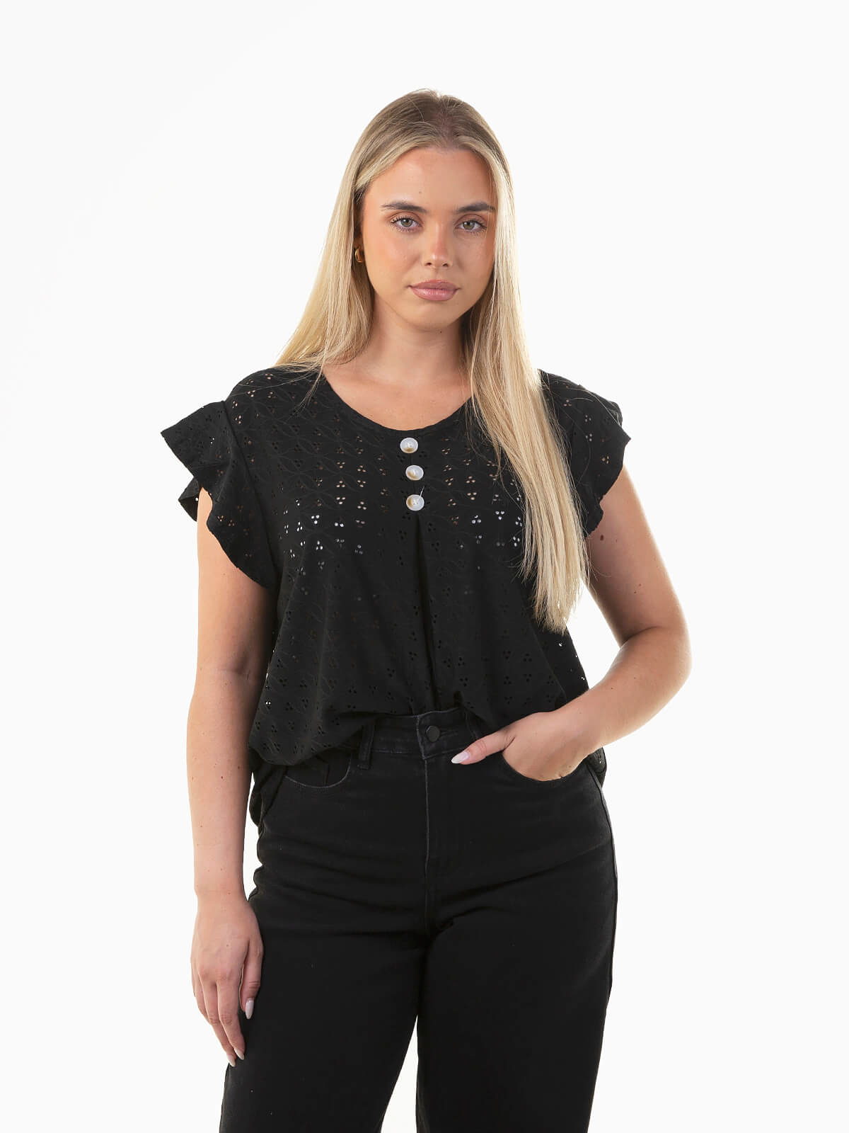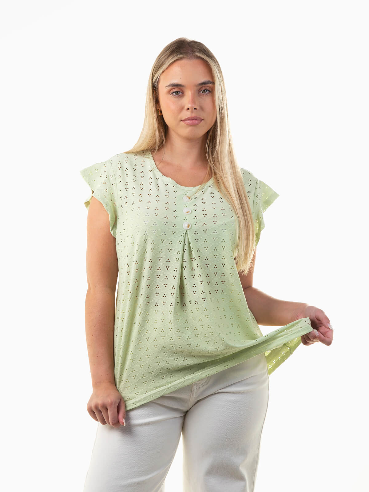 T-shirt de manga curta para senhora, com corte confortável e botões decorativos à frente. O detalhe de folho aplicado na cava acrescenta um toque feminino e delicado, enquanto o decote redondo mantém a simplicidade elegante. Combina facilmente com calças de ganga ou uma saia midi para um look versátil, moderno e cheio de charme.