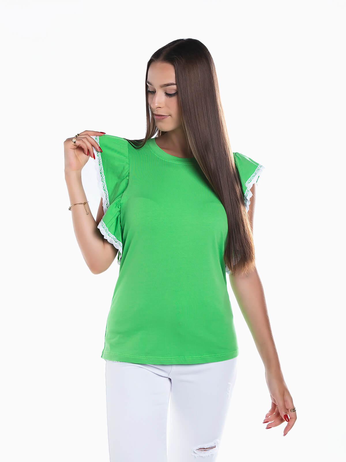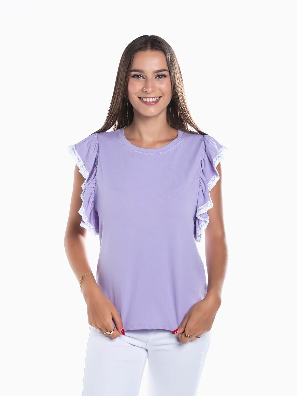 T-shirt com folhos e renda aplicados na cava. T-shirt sem mangas de gola redonda.