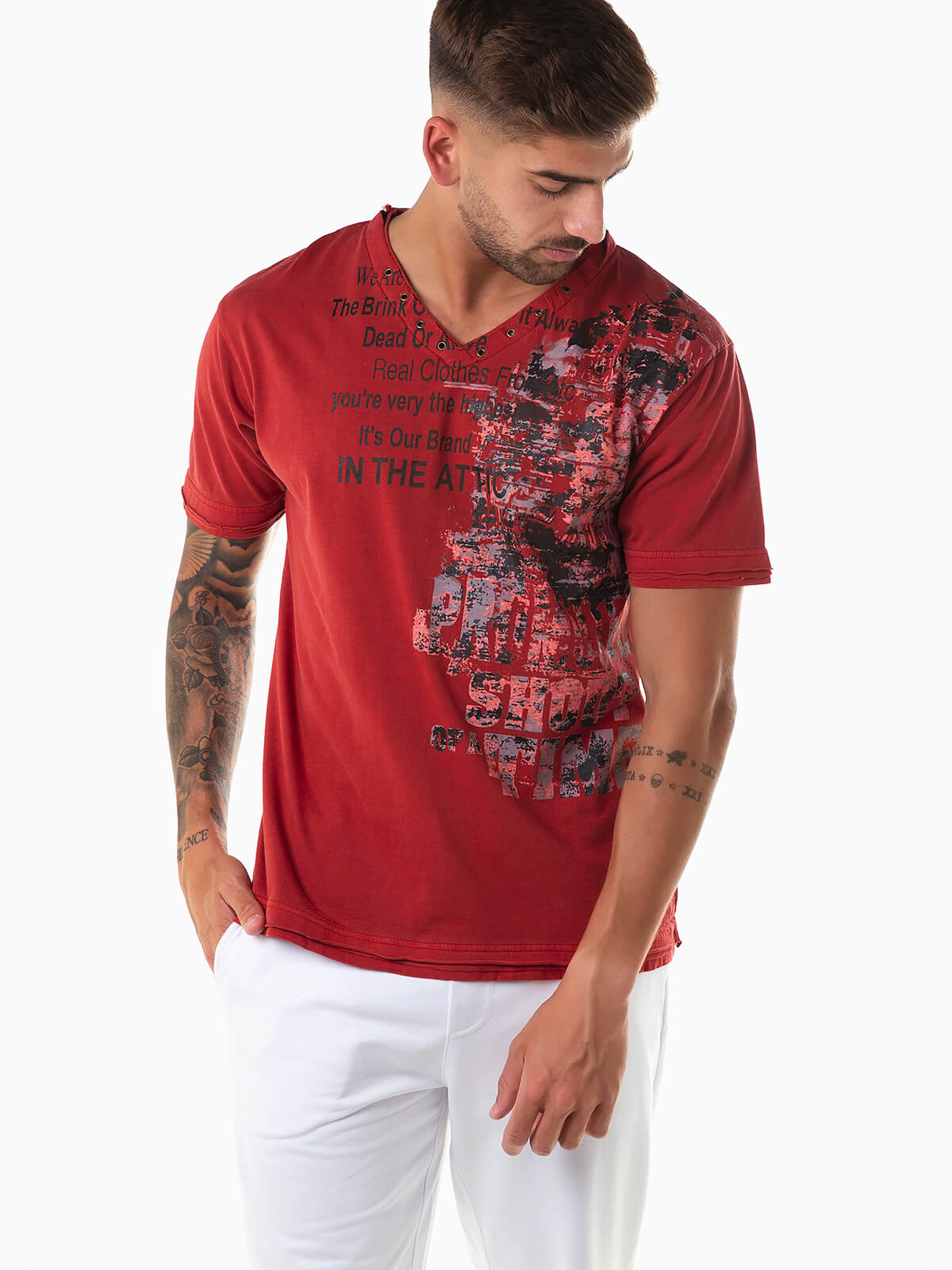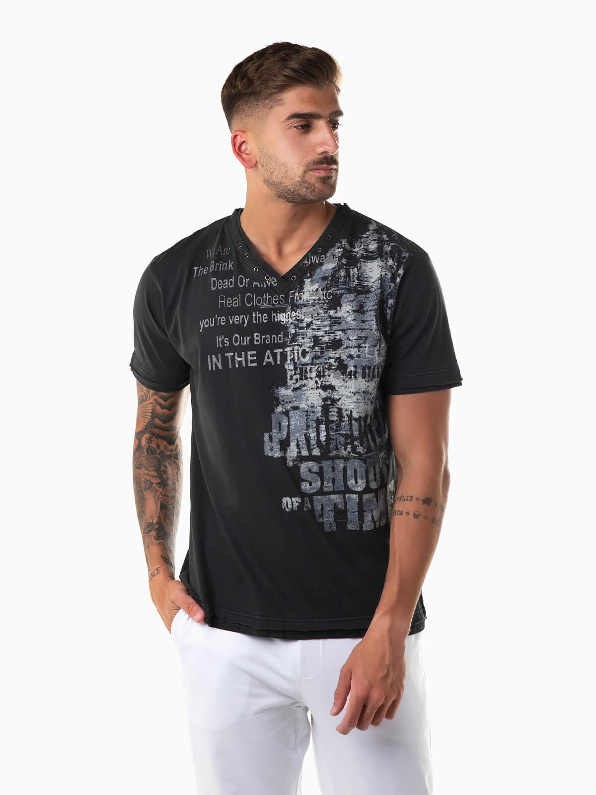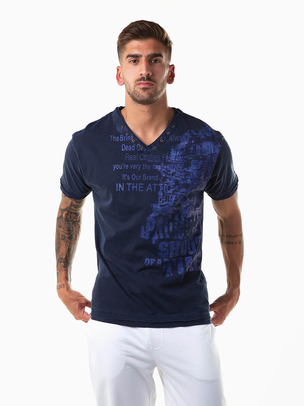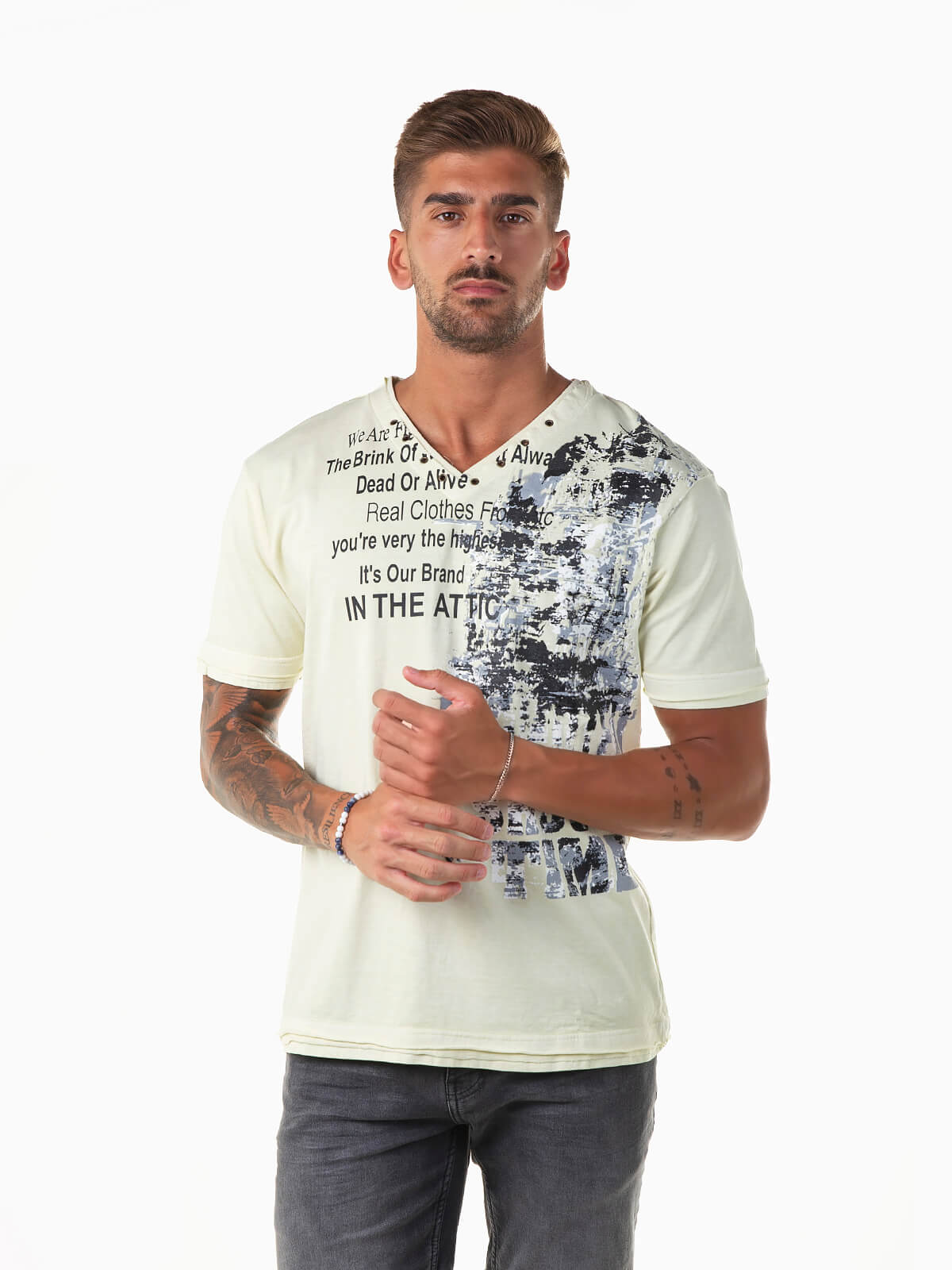 T-shirt com gola em V e manga curta. T-shirt para homem com estampado abstratos e letras.
