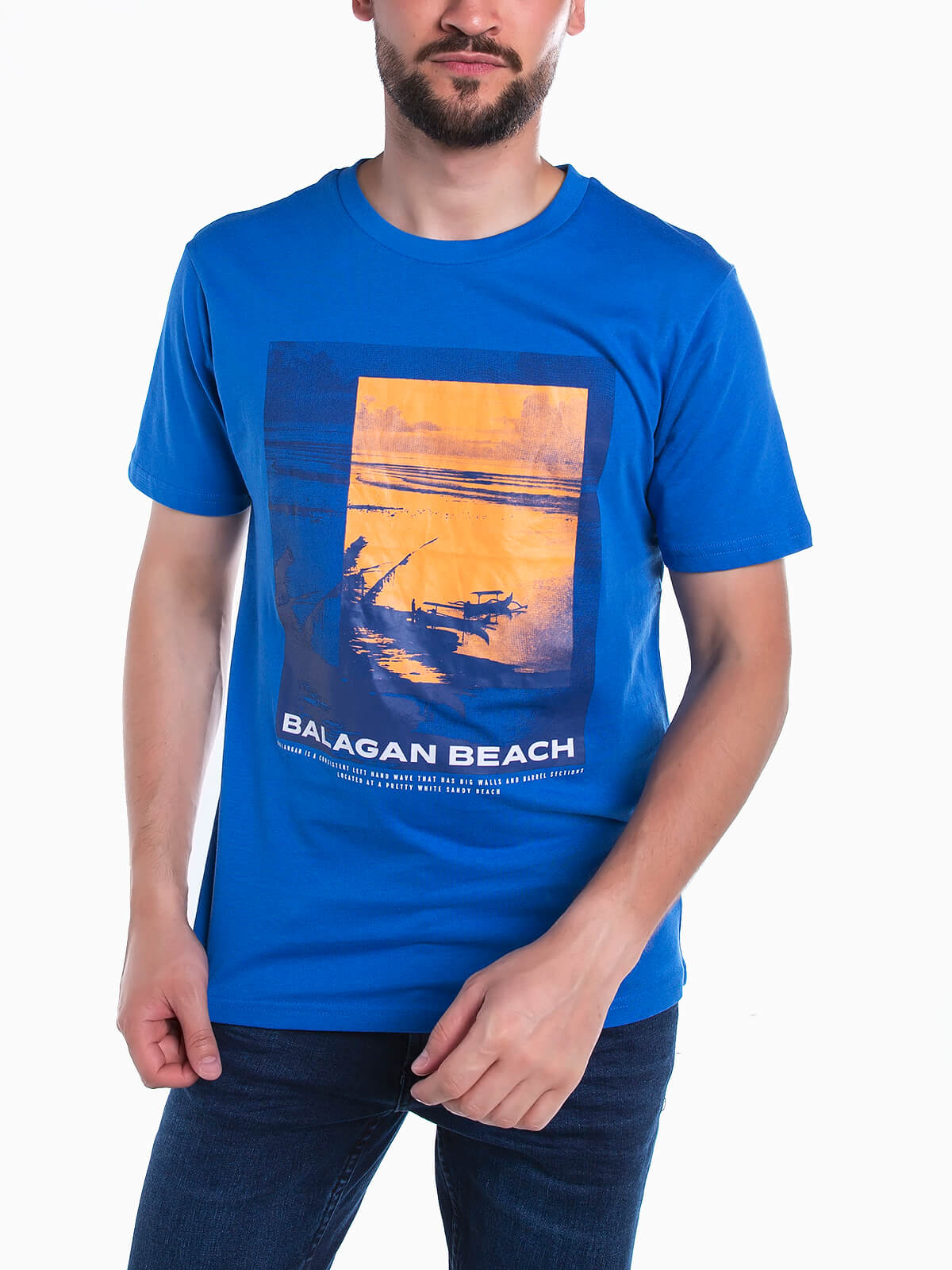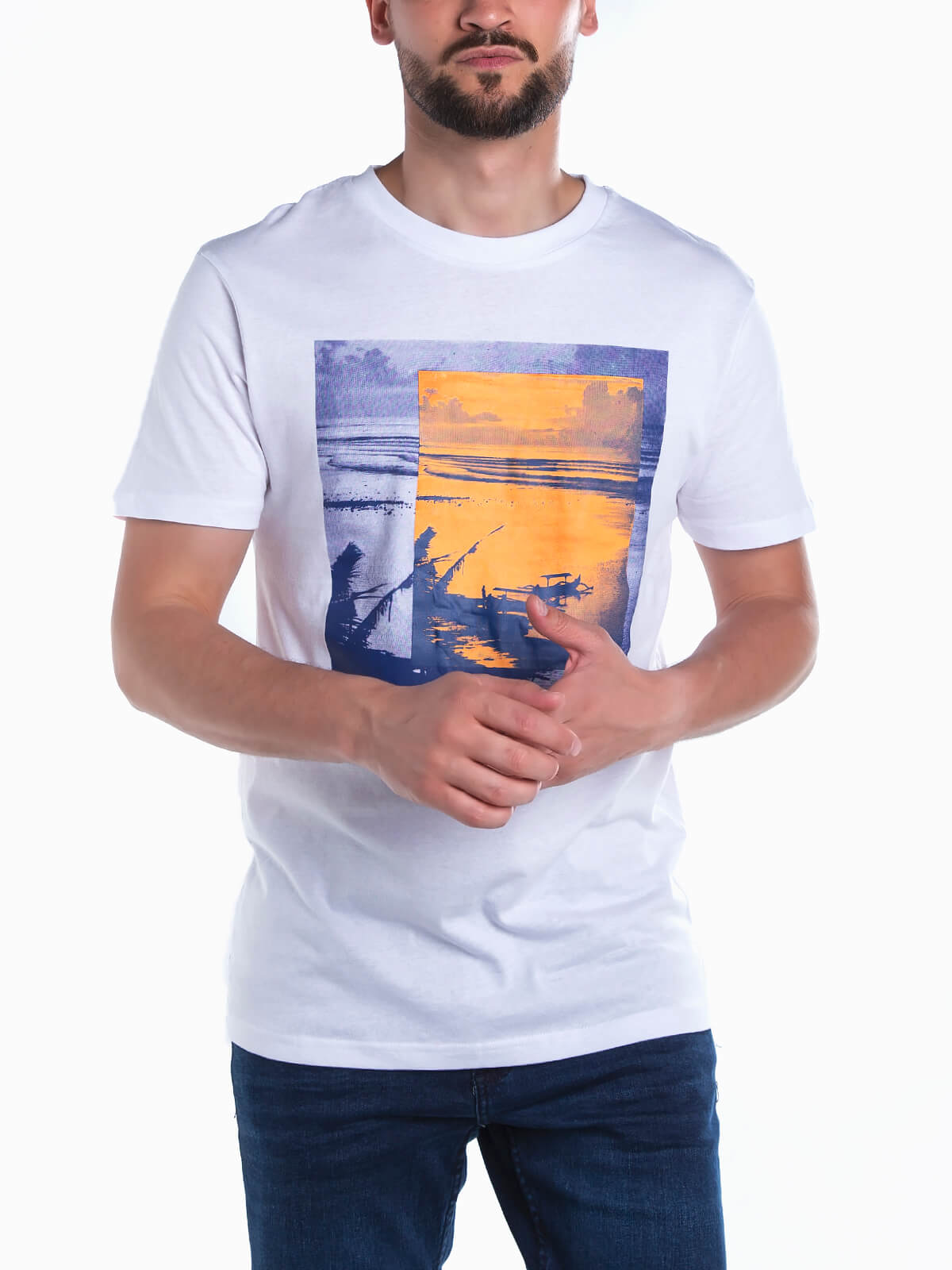 T-shirt com imagem estampada de manga curta para homem. T-shirt em tecido 100% algodão com gola redondo.
