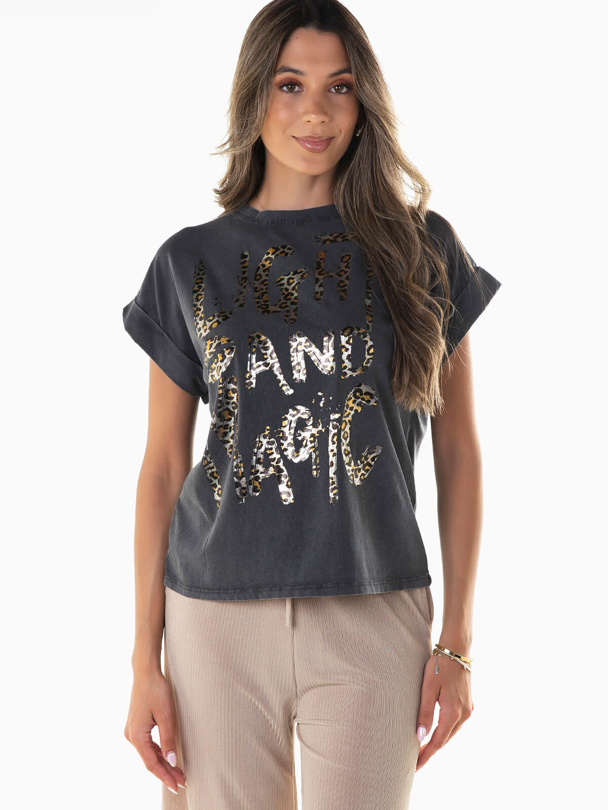 T-shirt cinzento escuro com estampado “Light and Magic” com pormenores animal print. T-shirt confecionada em algodão, com decote redondo e ombros ligeiramente descaídos. Modelo de manga curta a terminar em dobra.