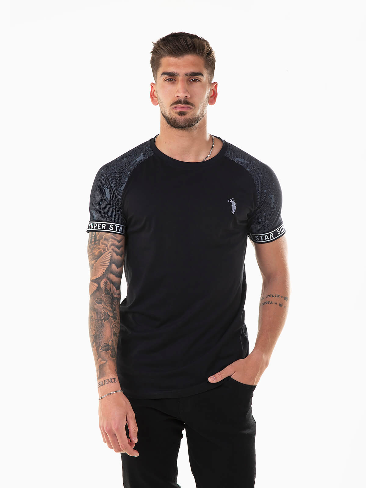 T-shirt com manga curta estampada e letras em contraste. T-shirt para homem com símbolo bordado no peito e gola redonda.