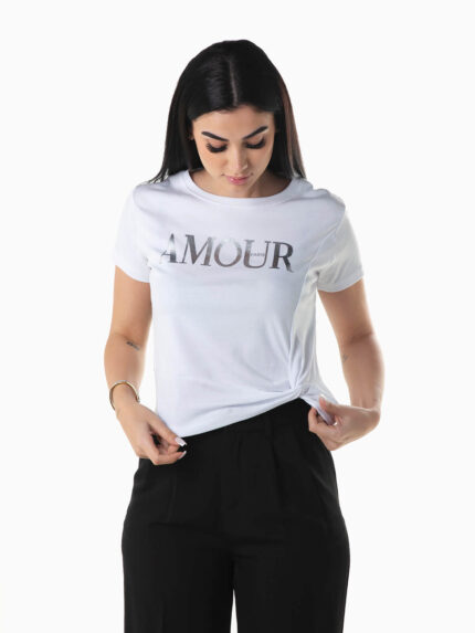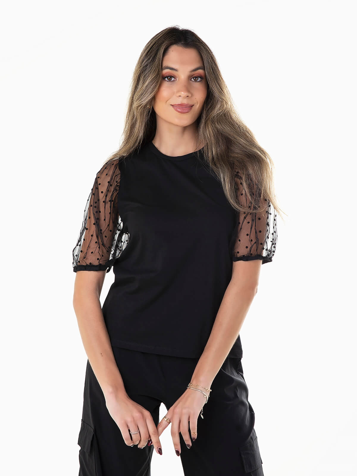 T-shirt de manga curta abalonada em tule com bolinhas. T-shirt com decote redondo.