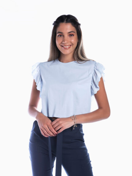 T-shirt com mangas em bordado inglês ligeiramente abalonadas. Manga curta com elástico fino forrado na bainha para efeito. T-shirt em algodão de corte reto com gola redonda.