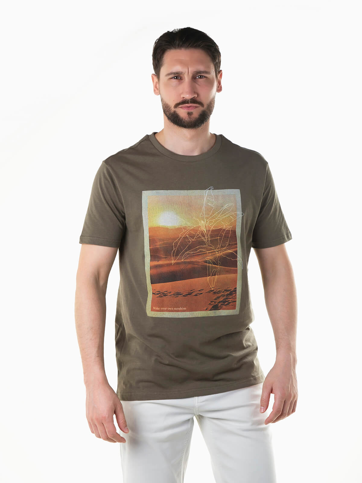 T-shirt de manga curta com paisagem estampada à frente. T-shirt 100% algodão, confortável e respirável com gola redonda.