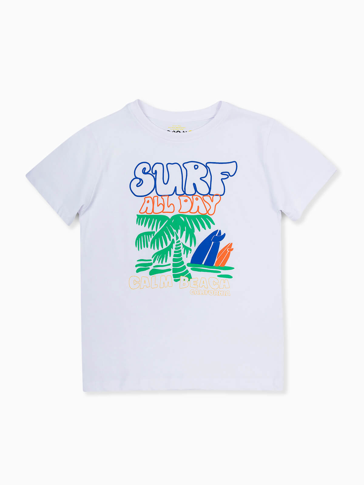T-shirt com estampado de palmeiras e letras em relevo. T-shirt de manga curta para menino com gola redonda.
