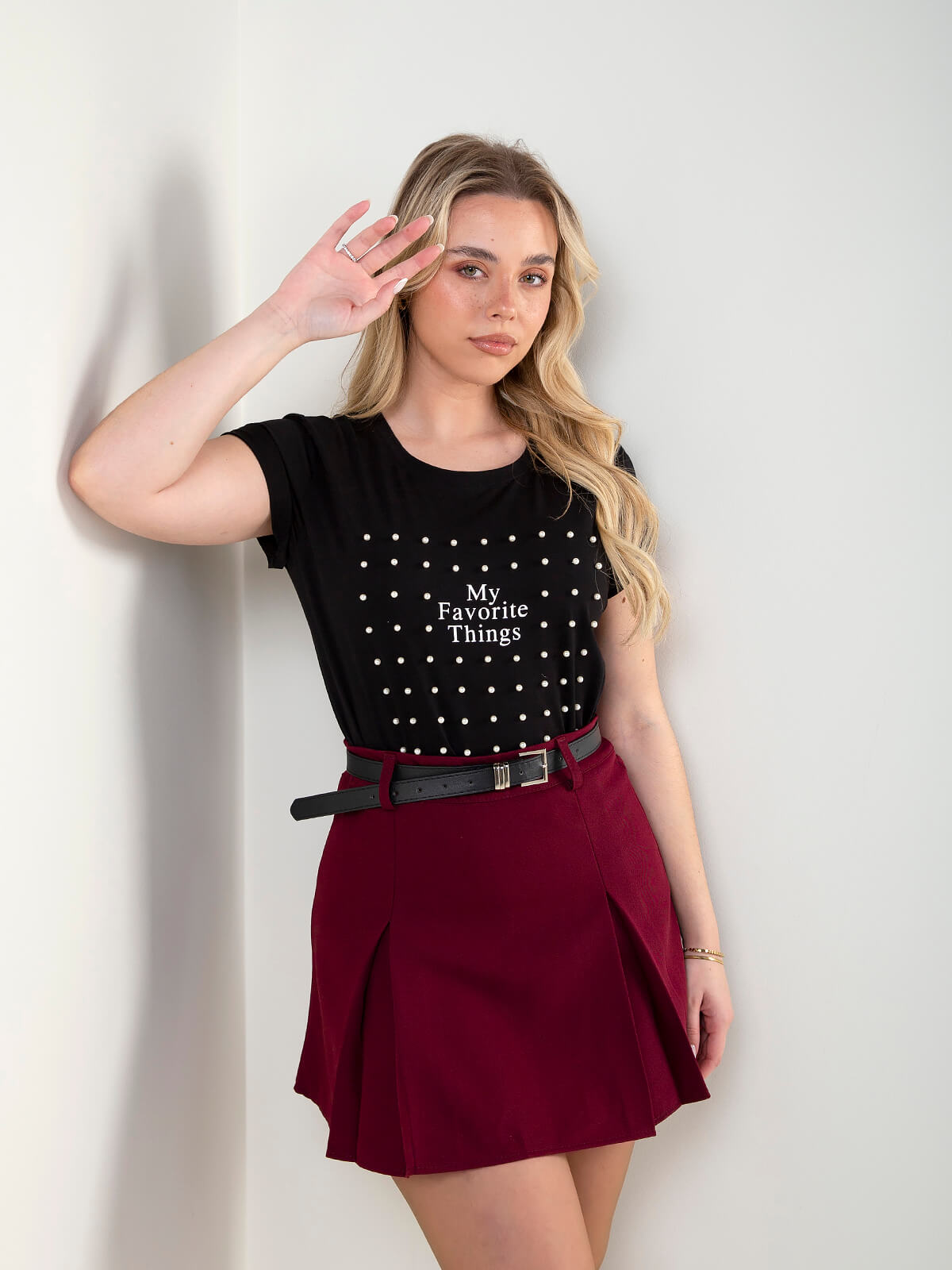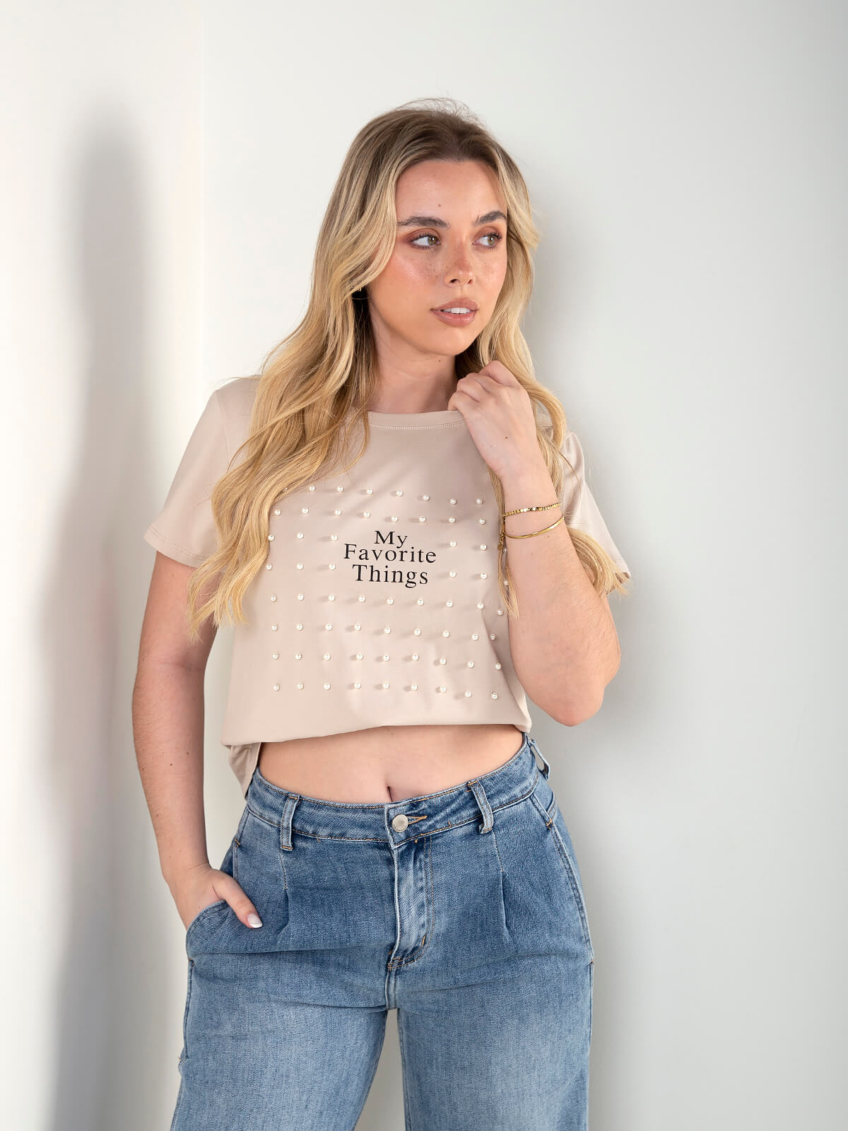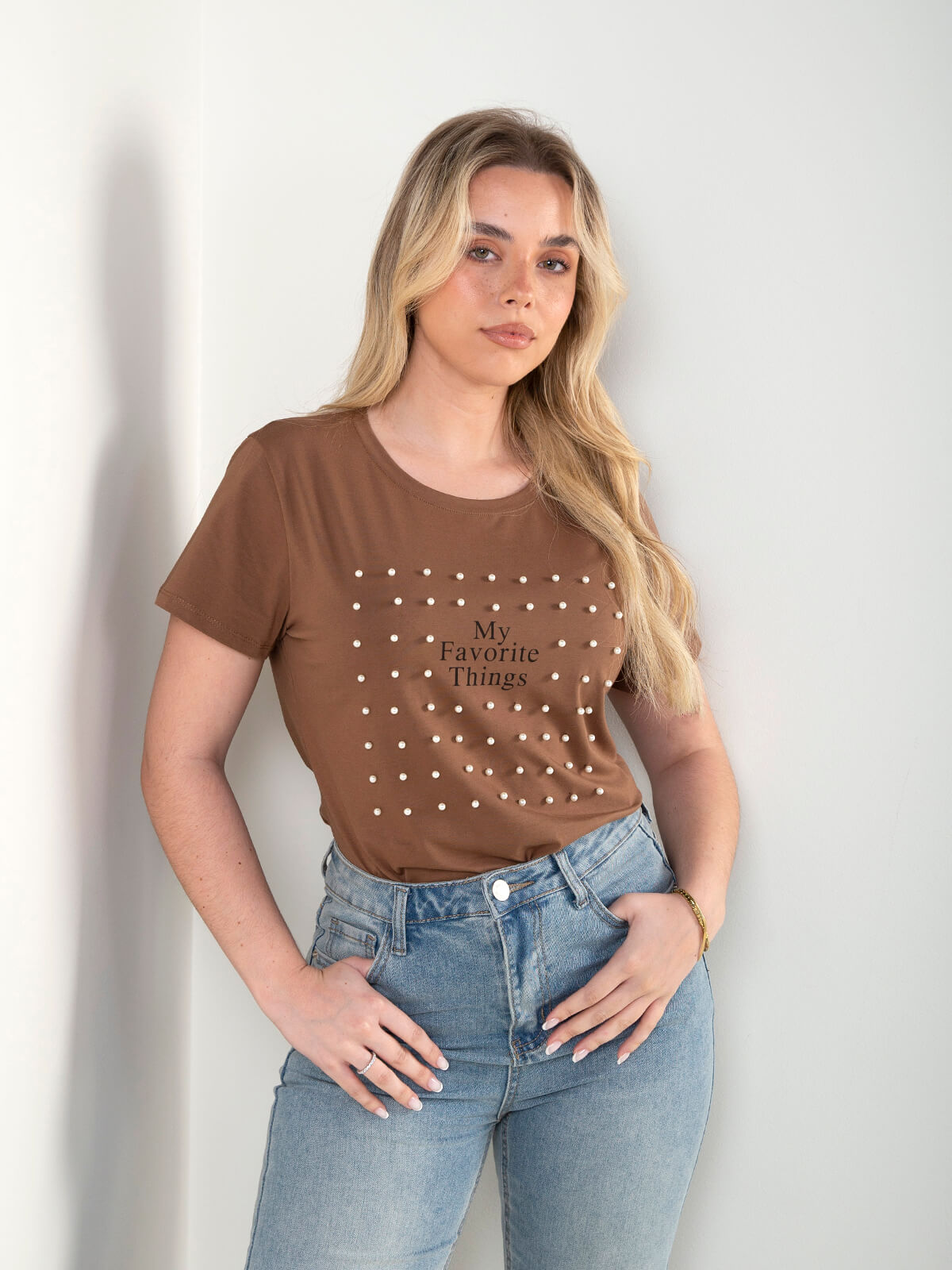 Início Mulher T-shirts T-shirt com pérolas e estampado