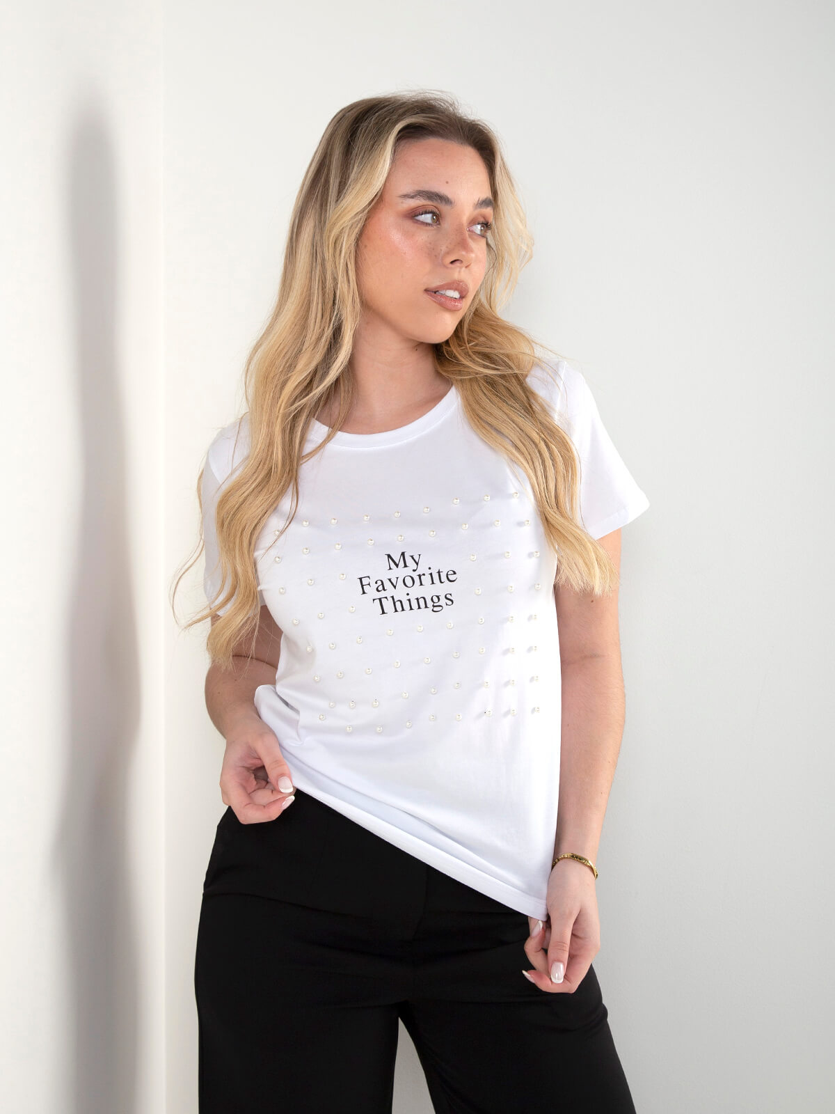 T-shirt branca de manga curta com aplicação de pérolas e estampado frontal. Uma peça feminina e versátil para looks casuais.