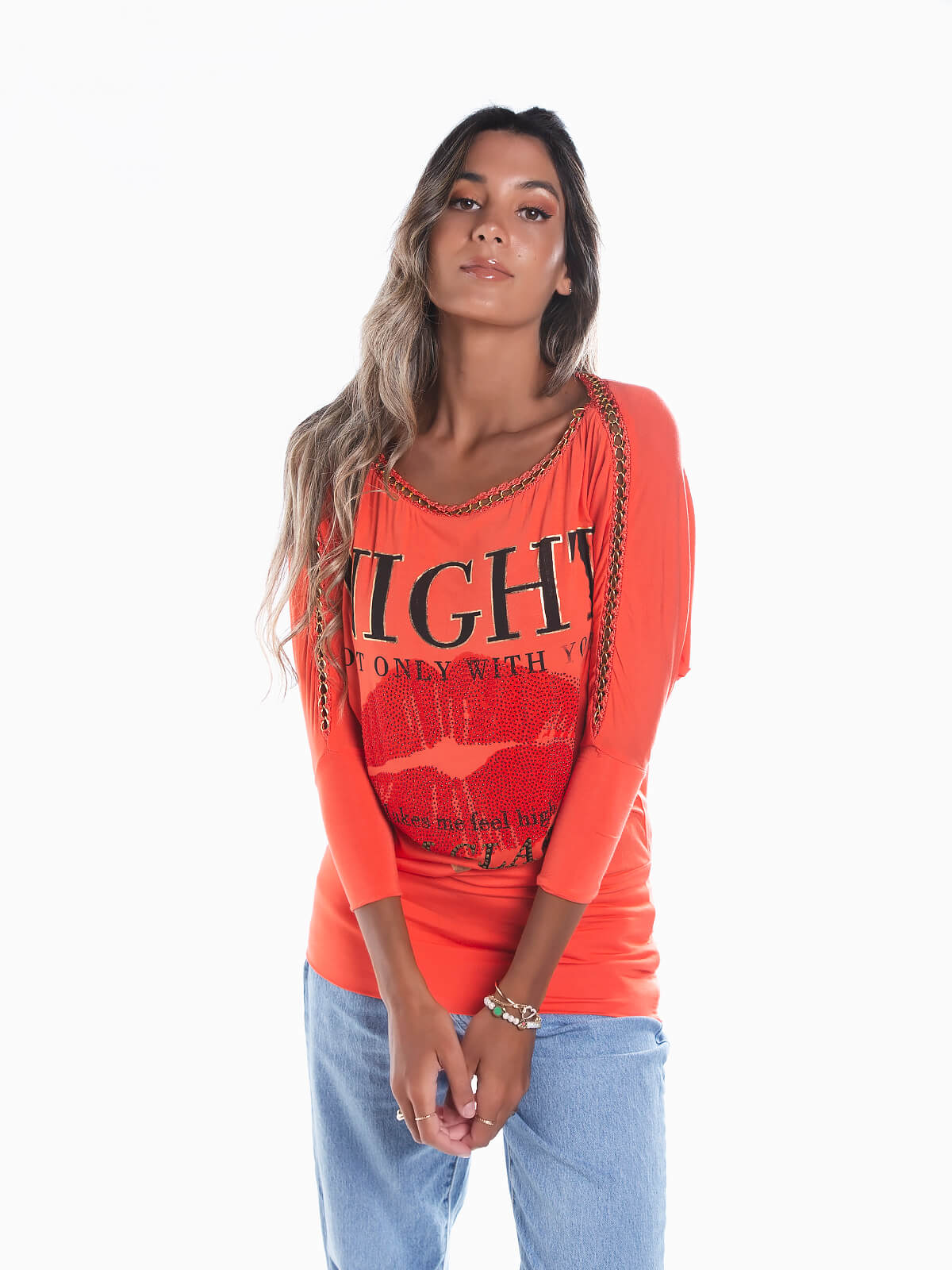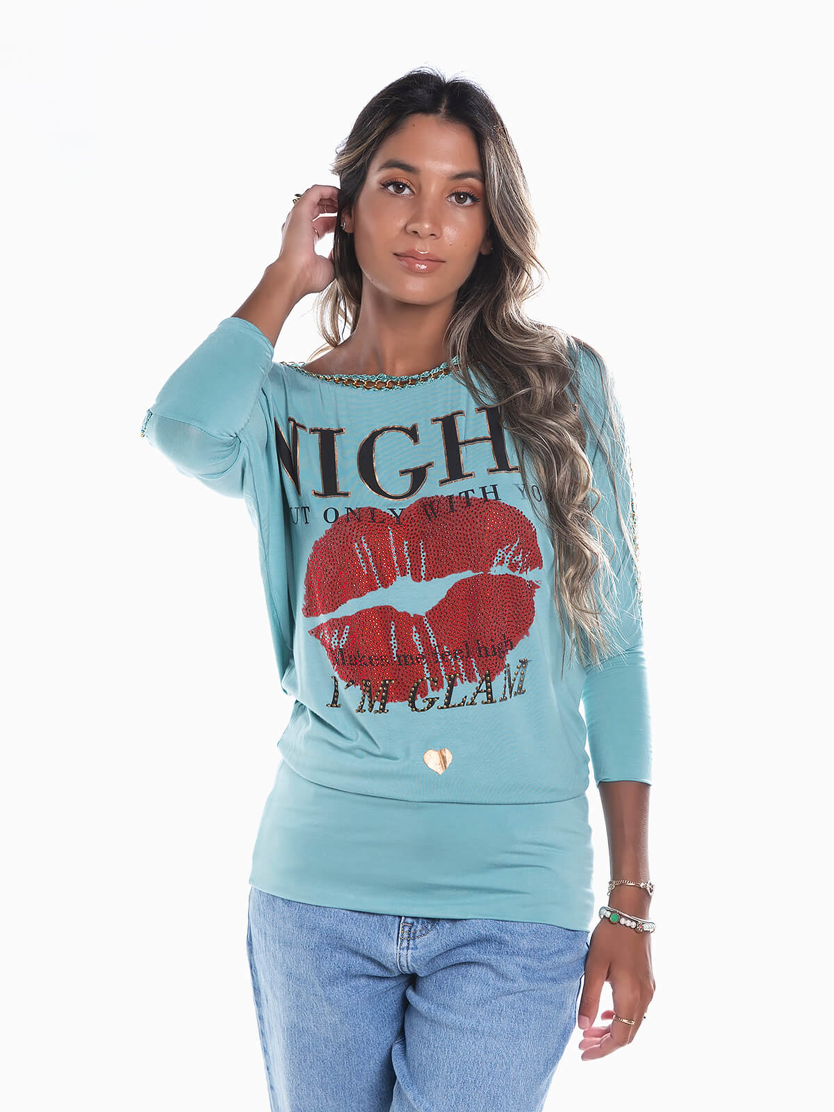 T-shirt comprida com manga 3/4 efeito morcego. T-shirt com estampado brilhante e corrente aplicada. Decote barco. Cós cintado.