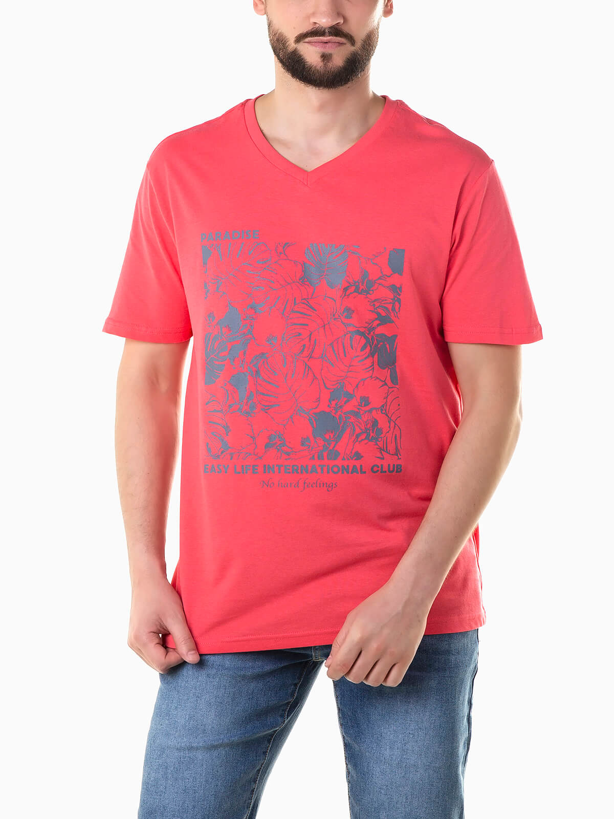T-shirt azul de manga curta para homem. T-shirt 100% algodão, respirável e confortável com motivos estampados. Gola em V.